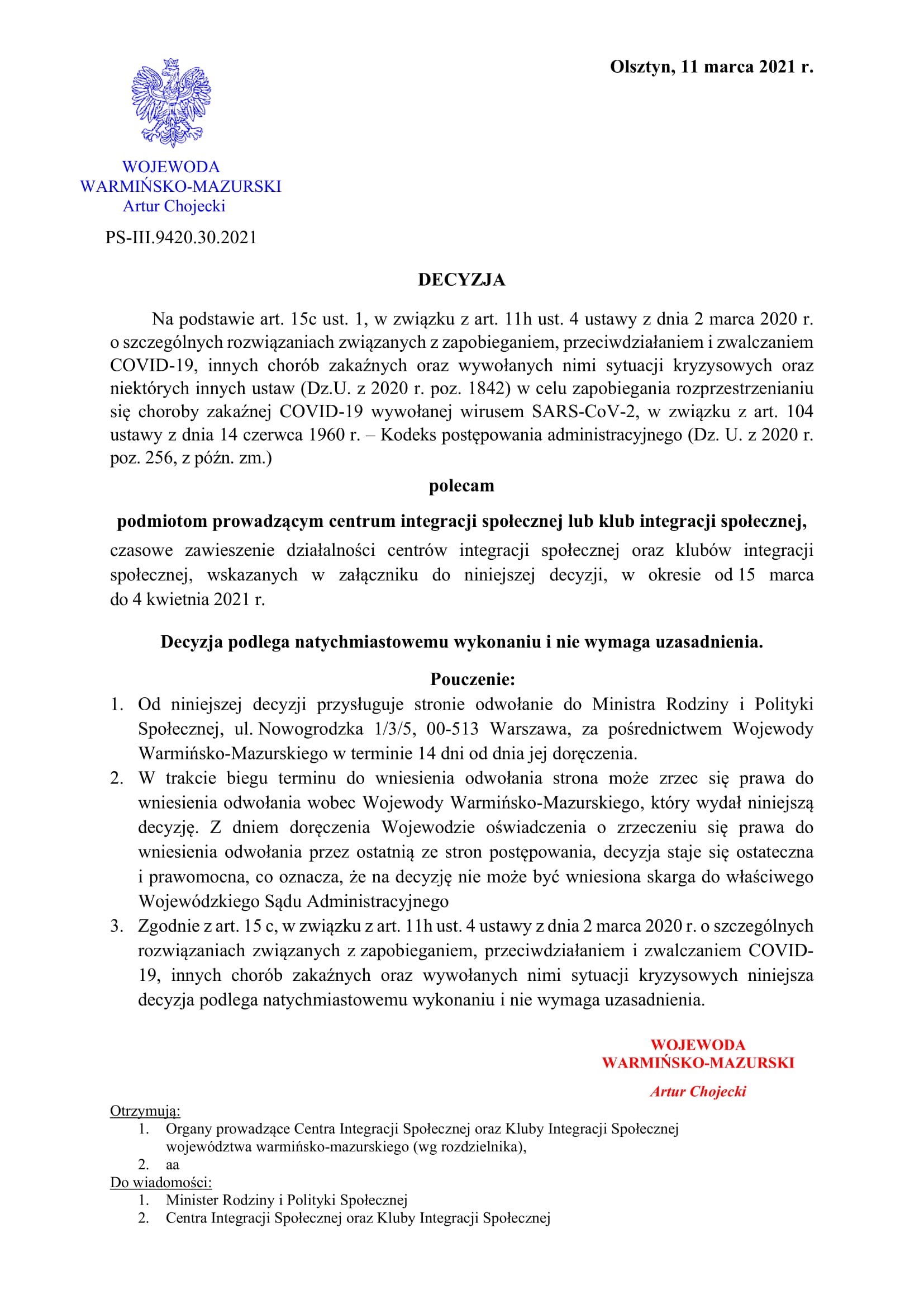 Decyzja z dnia 11 marca 2021 roku: Na podstawie art. 15c ust. 1, w związku z art. 11h ust. 4 ustawy z dnia 2 marca 2020 r. o szczególnych rozwiązaniach związanych z zapobieganiem, przeciwdziałaniem i zwalczaniem COVID-19, innych chorób zakaźnych oraz wywołanych nimi sytuacji kryzysowych oraz niektórych innych ustaw (Dz.U. z 2020 r. poz. 1842) w celu zapobiegania rozprzestrzenianiu się choroby zakaźnej COVID-19 wywołanej wirusem SARS-CoV-2, w związku z art. 104 ustawy z dnia 14 czerwca 1960 r. – Kodeks postępowania administracyjnego (Dz. U. z 2020 r. poz. 256, z późn. zm.).