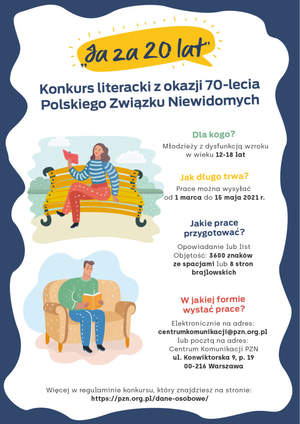Polski Związek Niewidomych obchodzi w tym roku 70. Urodziny. Z okazji jubileuszu ogłoszono konkurs pt. „Ja za 20 lat”. Autorzy trzech najlepszych prac otrzymają atrakcyjne nagrody. Zwycięskie teksty zostaną także opublikowane w czasopiśmie „Światełko”, które od kwietnia 2021 roku zmieni nazwę na „Pod lupą”.