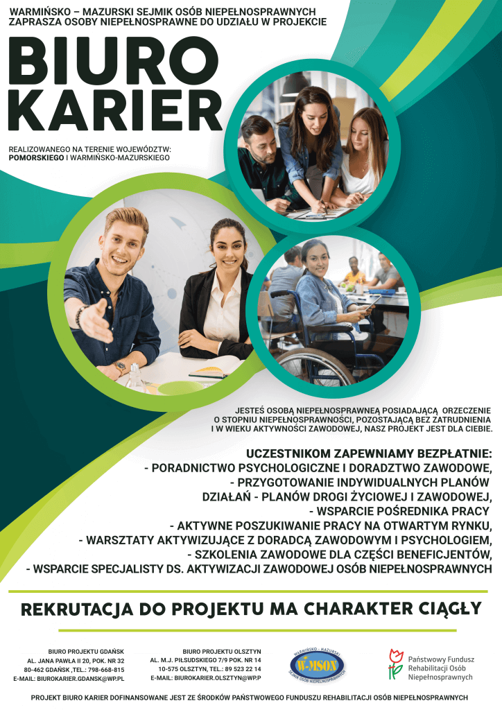 Uprzejmie przypominamy, że w Warmińsko – Mazurskim Sejmiku Osób Niepełnosprawnych do marca 2021 roku można wziąć udział w projekcie pn. „Biuro Karier”, realizowanym na terenie województw warmińsko – mazurskiego oraz pomorskiego. W projekcie mogą wziąć udział osoby z niepełnosprawnością posiadające orzeczenie o stopniu niepełnosprawności, pozostające bez zatrudnienia, w wieku aktywności zawodowej.
