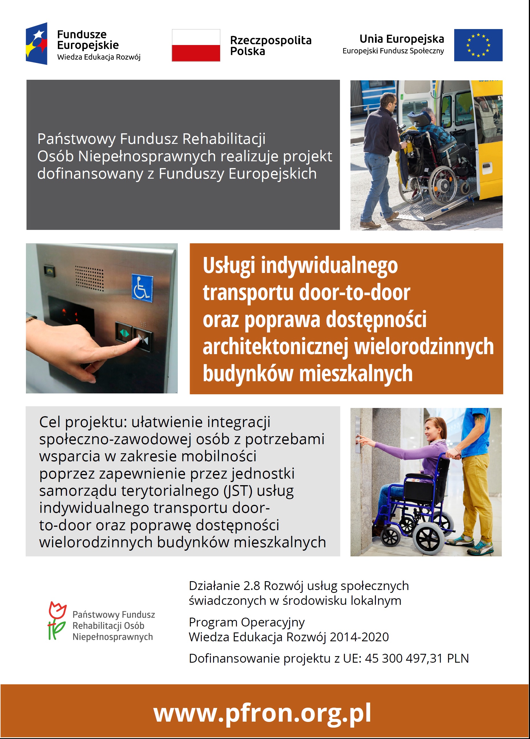 Projekt pt. „Usługi indywidualnego transportu door-to-door oraz poprawa dostępności architektonicznej wielorodzinnych budynków mieszkalnych” realizowany jest w ramach Osi priorytetowej II. Efektywne polityki publiczne dla rynku pracy, gospodarki i edukacji w ramach Działania 2.8 Rozwój usług społecznych świadczonych w środowisku lokalnym Programu Operacyjnego Wiedza Edukacja Rozwój na lata 2014-2020.