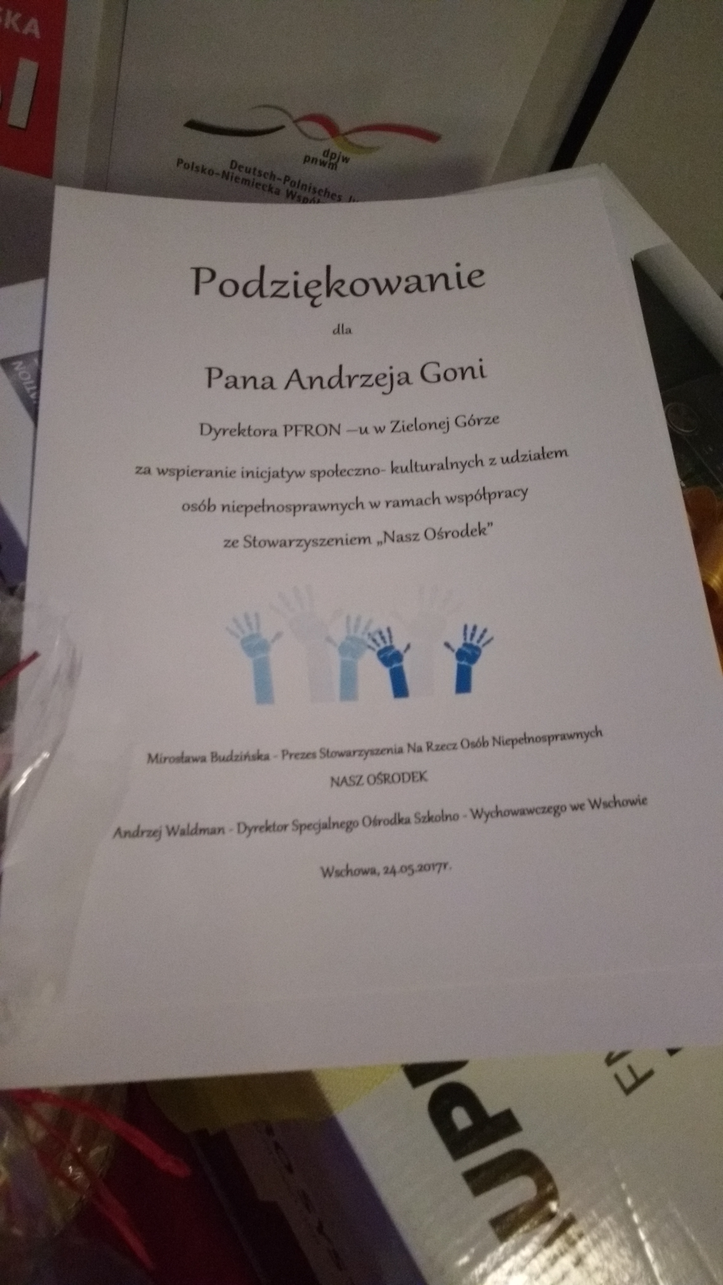 Tuż przed rozpoczęciem Dyrektor Oddziału Lubuskiego PFRON Pan Andrzej Gonia przekazał na ręce Prezes Stowarzyszenia na Rzecz Osób Niepełnosprawnych „Nasz Ośrodek” Pani Mirosławy Budzińskiej, nagrodę specjalną w postaci nowego aparatu fotograficznego w podziękowaniu za przygotowanie tegorocznego Przeglądu, a także organizacji III Marszu Akceptacji Osób Niepełnosprawnych we Wschowie 27 kwietnia br.
