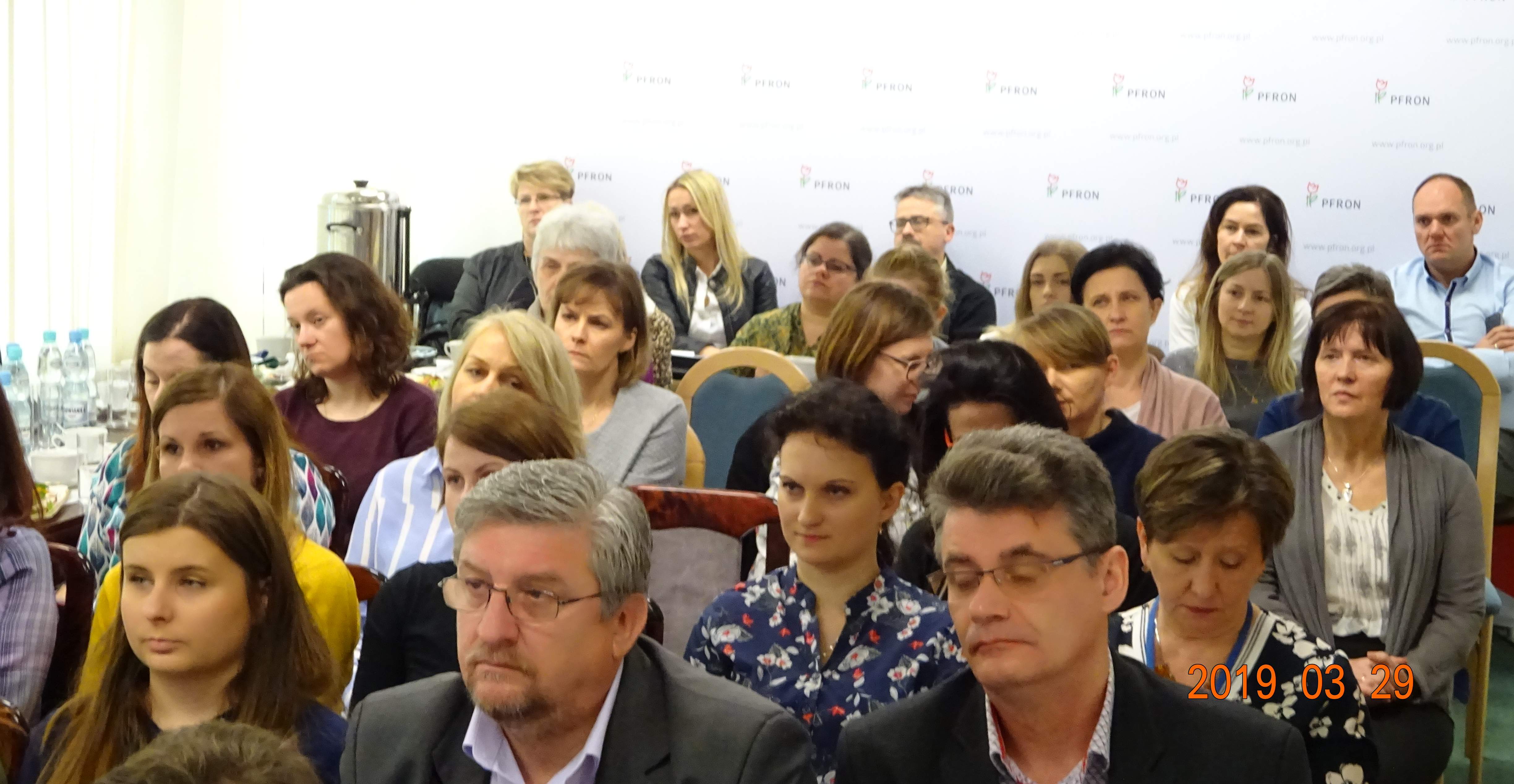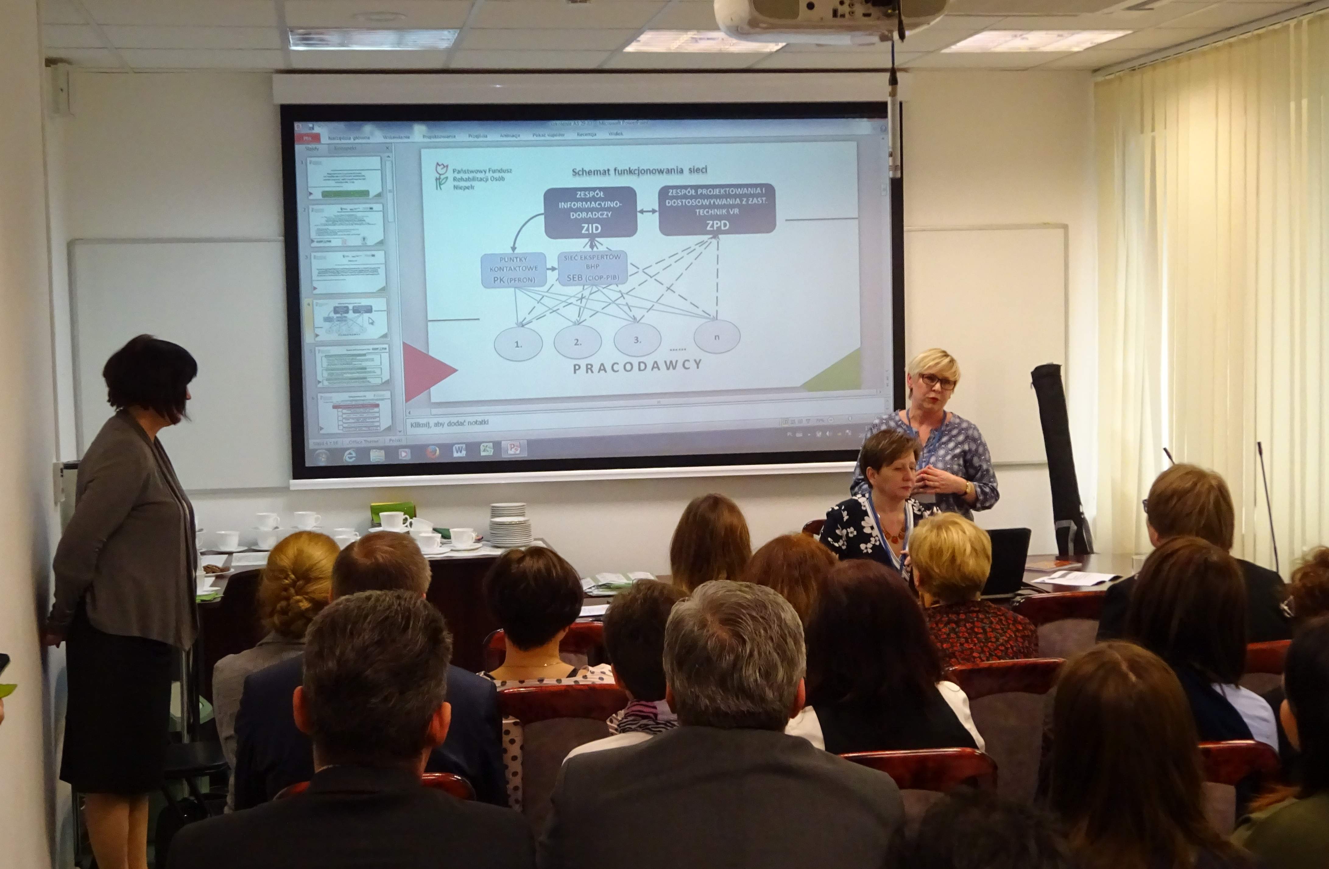 Z kolei pracownice Oddziału Beata Noceń i Teresa Piątek przedstawiły prezentację dotyczącą korzyści wynikających z zatrudniania osób z niepełnosprawnością na podstawie realizowanego w tym roku programu „Wypracowanie i upowszechnianie, we współpracy z partnerami społecznymi, modelu wsparcia osób niepełnosprawnych w środowisku pracy (finansowany ze środków POWR, Działanie 2.6. Wysoka jakość polityki na rzecz włączenia społecznego i zawodowego osób niepełnosprawnych).