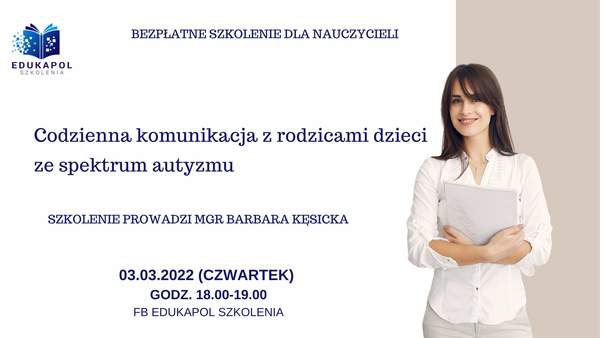 W dniu dzisiejszym, tj. 03.03.2022 roku w godzinach 18:00-19:00 Edukapol Szkolenia organizuje bezpłatne webinarium zatytułowane „Codzienna komunikacja z rodzicami dzieci ze spektrum autyzmu”.