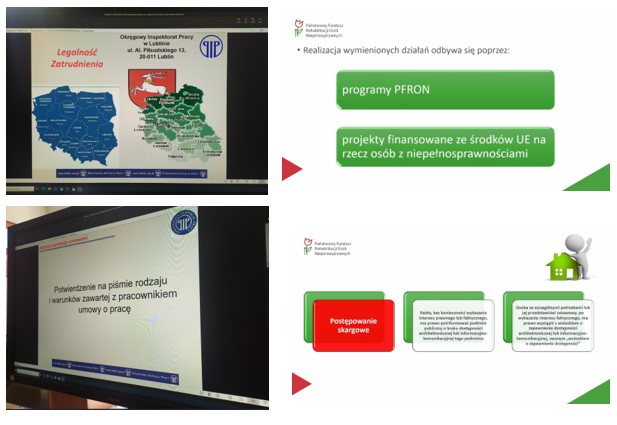 Inspektorzy pracy wygłosili prelekcję na temat prawnych i praktycznych stron zatrudnienia osób z niepełnosprawnościami, poparte przykładami i kazusami. Temat dostępności informacyjno-komunikacyjnej, formy dofinansowania do zatrudnienia osób niepełnosprawnych, jak również temat dostosowania miejsca pracy dla osób z orzeczeniem o niepełnosprawności przedstawiła Małgorzata Żywicka.