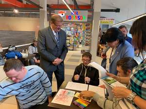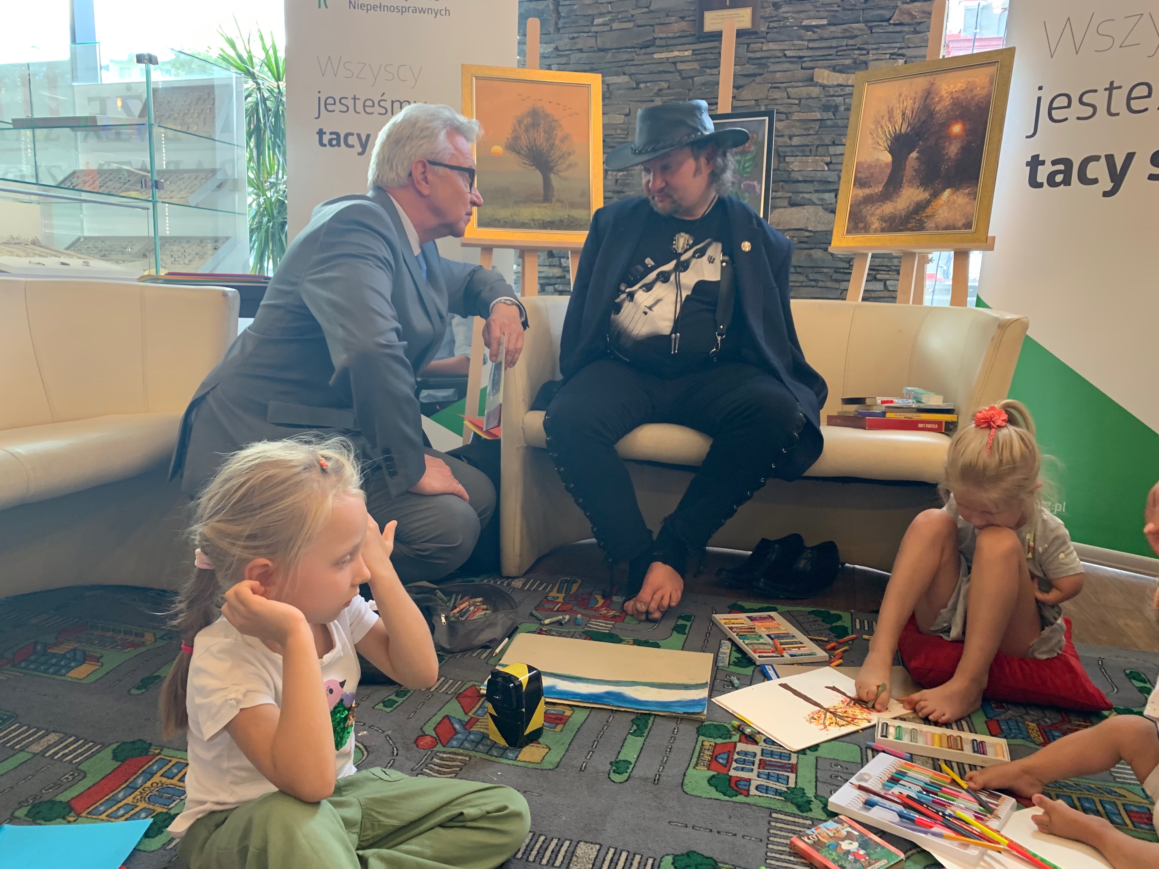 W wernisażu i spotkaniu z artystami wzięli udział Pełnomocnik Rządu ds. Osób Niepełnosprawnych Krzysztof Michałkiewicz, Zastępca Prezesa Zarządu Państwowego Funduszu Rehabilitacji Osób Niepełnosprawnych ds. finansowych Tomasz Maruszewski oraz dyrektor małopolskiego oddziału PFRON Marta Mordarska.