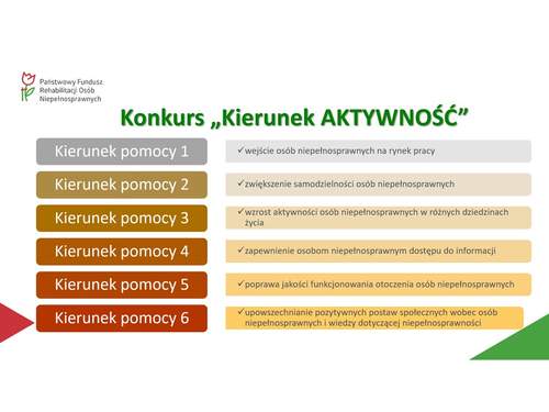 Zarząd PFRON podjął piątą decyzję w sprawie udzielenia dofinansowań organizacjom pozarządowym na realizację w 2020 roku wniosków złożonych w ramach konkursu pn. „Kierunek AKTYWNOŚĆ” (konkurs o zlecenie realizacji zadań w formie wsparcia nr 1/2019), ogłoszonego na podstawie art. 11 i art. 13 ustawy z dnia 24 kwietnia 2003 r. o działalności pożytku publicznego i o wolontariacie, w związku z art. 36 ustawy z dnia 27 sierpnia 1997 r. o rehabilitacji zawodowej i społecznej oraz zatrudnianiu osób niepełnosprawnych.