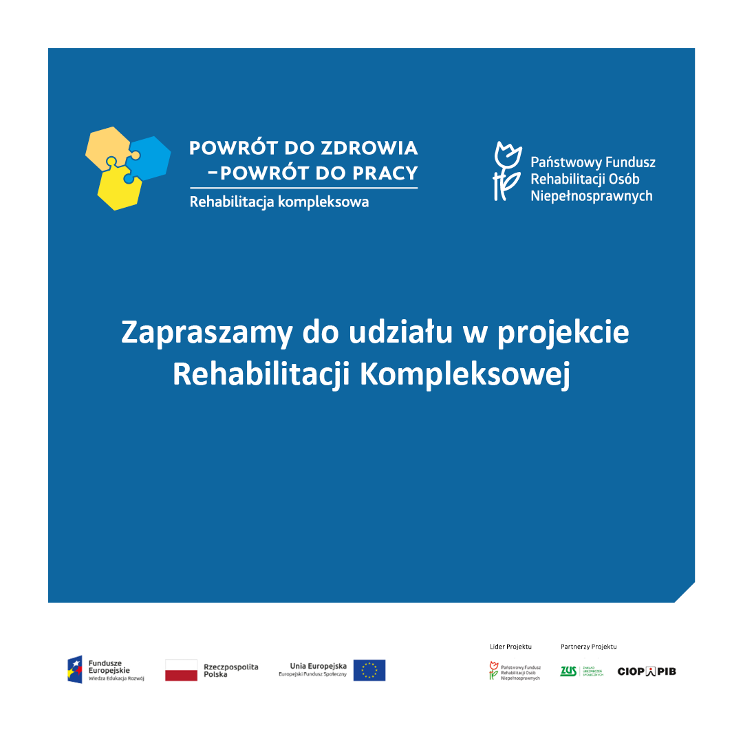 Zapraszamy wszystkich chętnych do wzięcia udziału w projekcie kompleksowej rehabilitacji. Projekt skierowany jest do wszystkich, którzy z powodu choroby lub wypadku utracili możliwość wykonywania dotychczasowego zawodu, a chcieliby podjąć inną pracę, adekwatną do zainteresowań i stanu zdrowia. To również szansa dla tych, którzy ze względów zdrowotnych nigdy nie pracowali, a chcieliby wejść z sukcesem na rynek pracy.