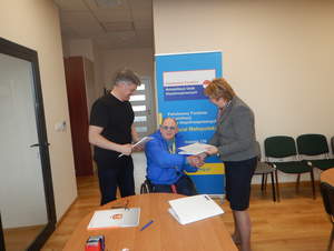 Podpisanie umów było okazją do spotkania Marty Mordarskiej - dyrektor Oddziału Małopolskiego PFRON z Andrzejem Ziembowskim -konsultantem ds. osób niepełnosprawnych z Urzędu Miasta Tarnowa. W trakcie rozmowy poruszono tematy związane realizacją polityki społecznej wobec osób niepełnosprawnych z miasta Tarnowa.