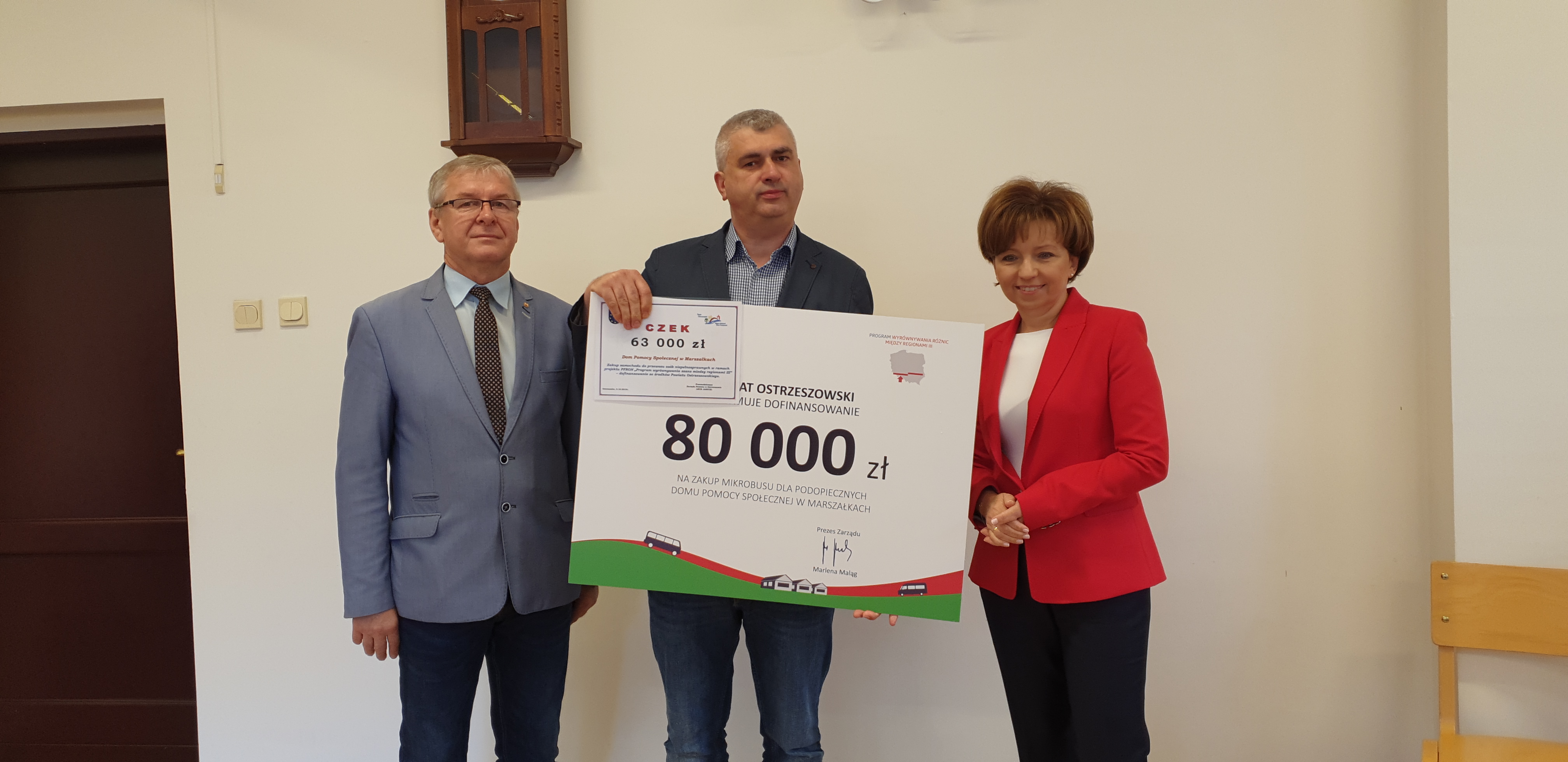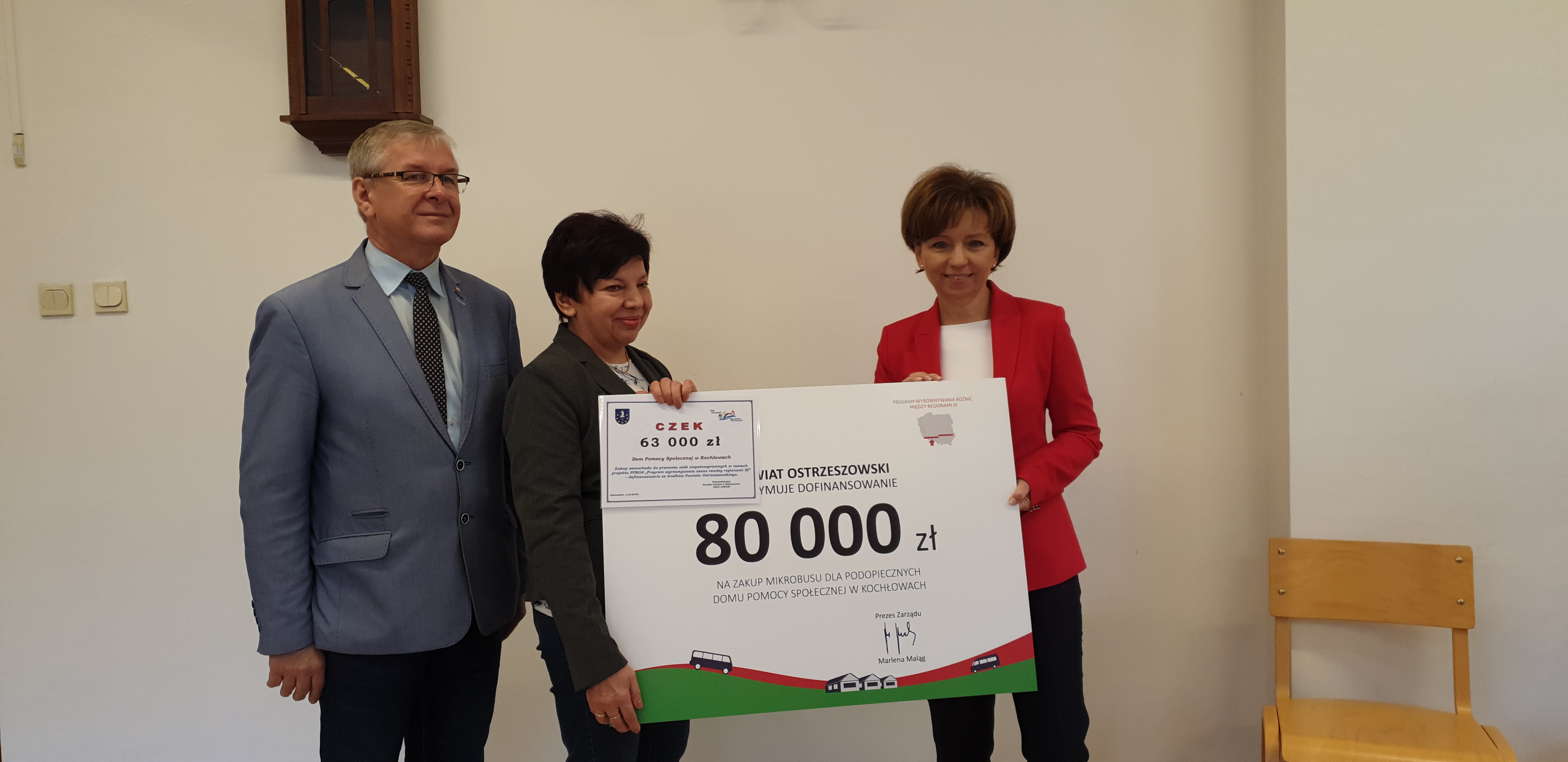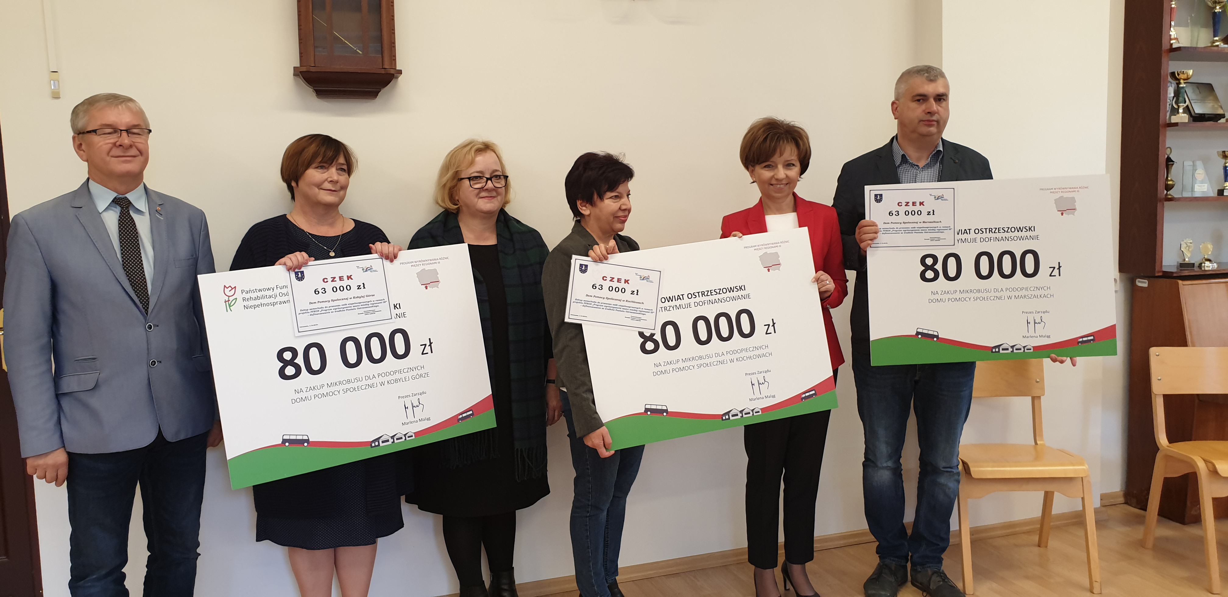 Dzięki 240 tys. zł przekazanym przez PFRON mieszkańcy powiatu ostrzeszowskiego w Wielkopolsce otrzymają trzy 9-osobowe mikrobusy. Symboliczne czeki przekazała dziś na ten cel prezes zarządu PFRON Marlena Maląg.