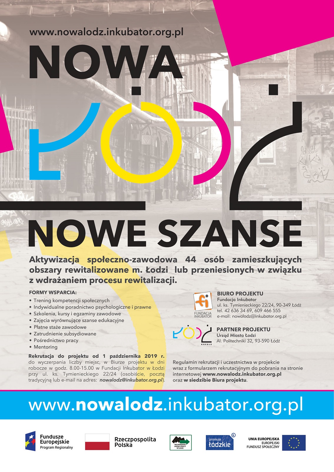 Formularze rekrutacyjne przyjmowane są w dni robocze od godz. 8.00-15.00 w Biurze projektu w Fundacji Inkubator w Łodzi przy ul. ks. Tymienieckiego 22/24 (osobiście, pocztą tradycyjną lub e-mail na adres nowalodz@inkubator.org.pl). tel. 42 633 16 55, e-mail: sekretariat@inkubator.org.pl,