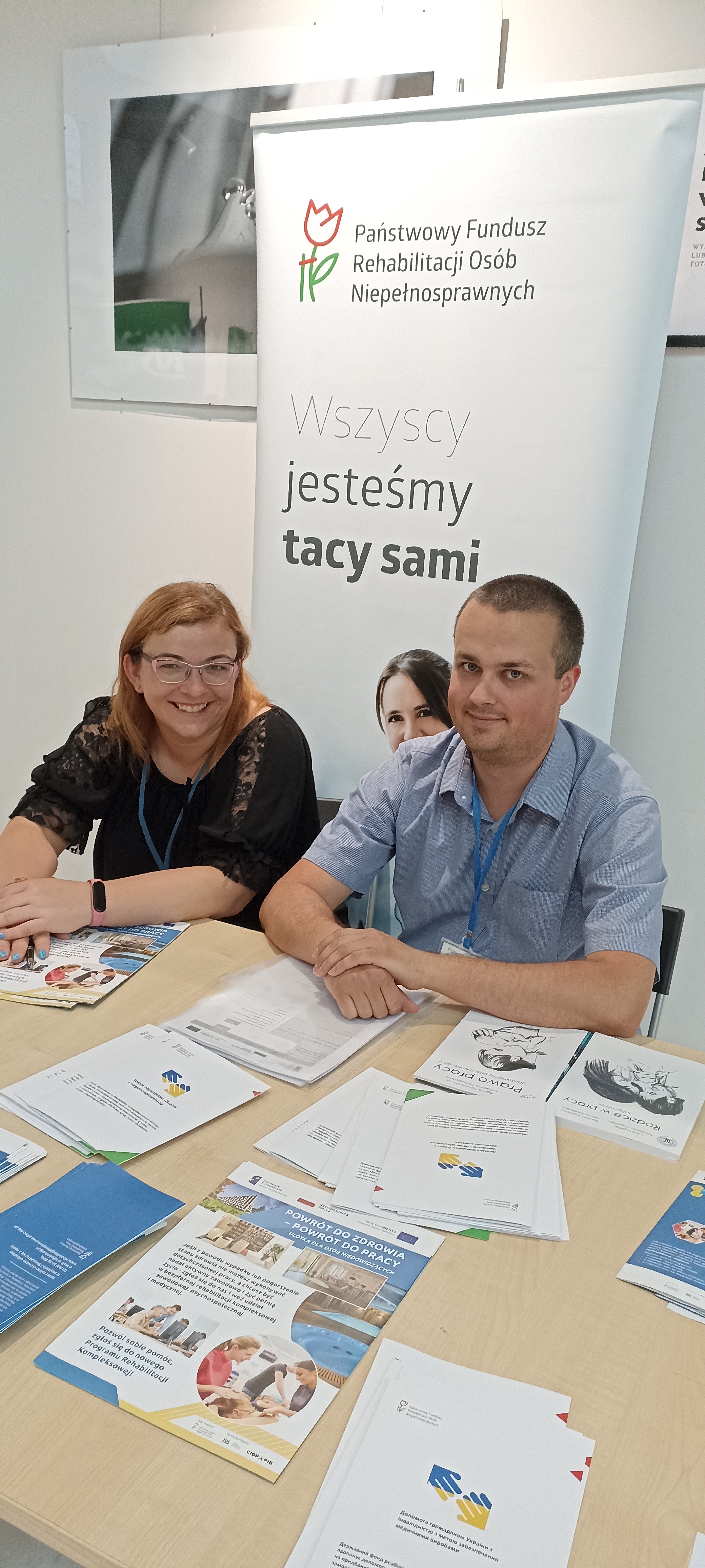 Przedstawiciele Funduszu prezentowali materiały i informacje nt. projektu „Wypracowanie i pilotażowe wdrożenie modelu kompleksowej rehabilitacji umożliwiającej podjęcie lub powrót do pracy”, a także form wsparcia dla niepełnosprawnych uchodźców z Ukrainy oraz udzielali odpowiedzi na zapytania uczestników Targów Pracy.