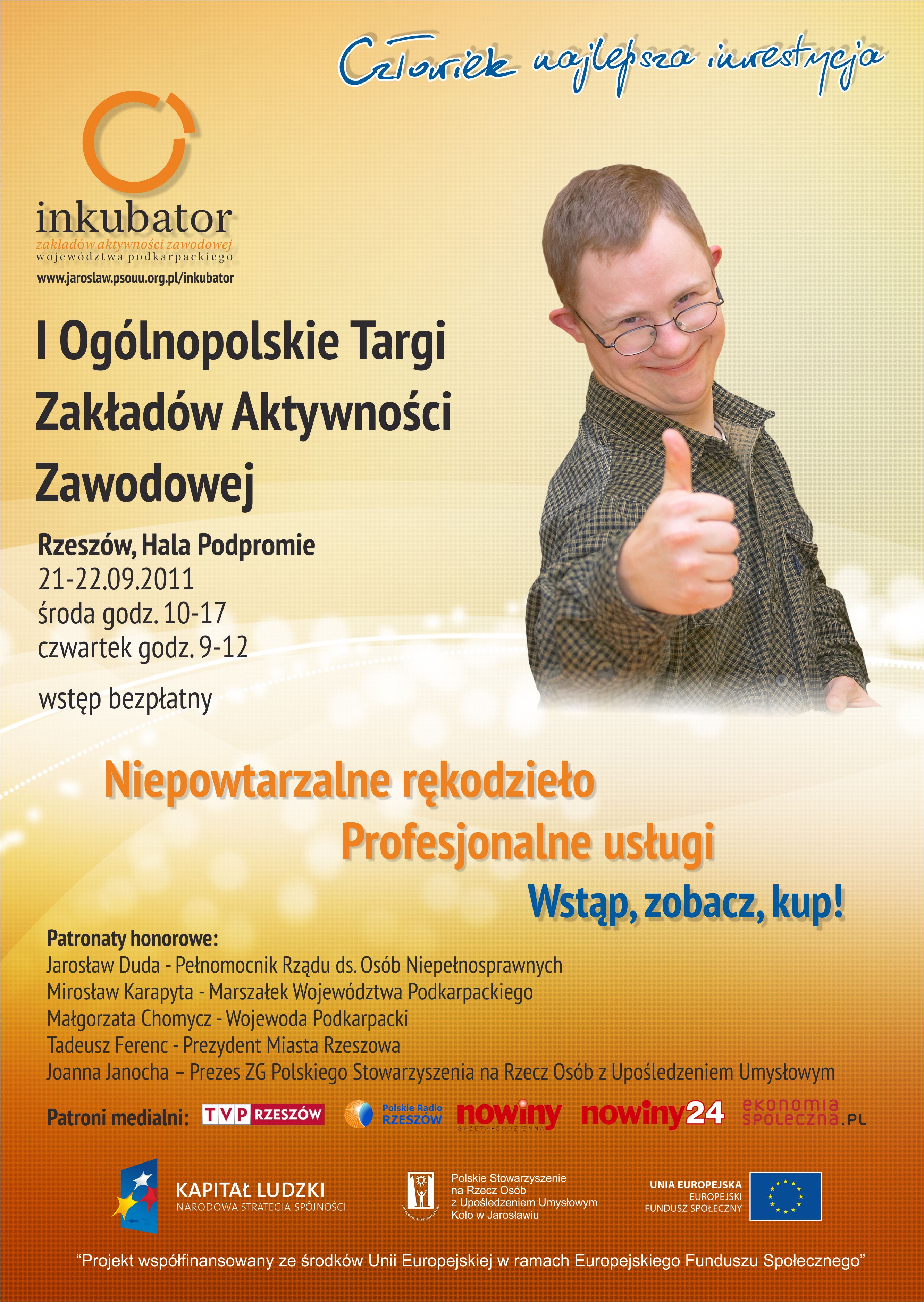 Istotną częścią Targów była konferencja poświęcona aktywizacji zawodowej osób niepełnosprawnych. Wzięli w niej udział prelegenci, którzy zajmują się kształtowaniem systemowych rozwiązań dotyczących aktywizacji: parlamentarzyści, przedstawiciele administracji rządowej, samorządu województwa, instytucji działających na rzecz osób niepełnosprawnych. Konferencja to także seria prelekcji i paneli specjalistycznych; ich wiodące tematy to: planowane zmiany w rozporządzeniu regulującym działalność ZAZ, partnerstwo z samorządem w zakresie przeciwdziałania marginalizacji osób niepełnosprawnych czy innowacyjne formy produkcji i usług. Więcej informacji o Projekcie „Inkubator Zakładów Aktywności Zawodowej Województwa Podkarpackiego” znaleźć można na stronie: www.jaroslaw.psou.org.pl//inkubator