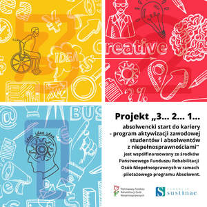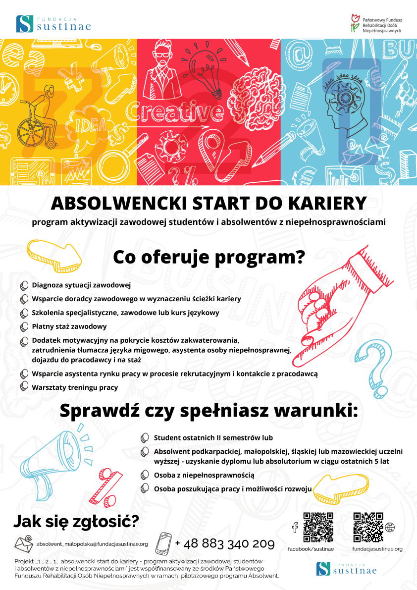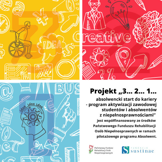 Absolwentów i studentów z niepełnosprawnościami, którzy chcieliby skorzystać z pomocy Fundacji Sustinae w ramach programu PFRON „Absolwent” zapraszamy do udziału w nowym projekcie „3…2…1…absolwencki start do kariery- program aktywizacji zawodowo-edukacyjnej studentów i absolwentów z niepełnosprawnościami”. Do udziału zapraszamy studentów ostatniego roku studiów lub absolwentów, którzy w ciągu ostatnich 5 lat ukończyli małopolską, mazowiecką, śląską lub podkarpacką uczelnię wyższą. Wsparcie zostanie zrealizowane od momentu zakwalifikowania do udziału do końca września 2021 r. poprzez zintegrowane działania oparte o diagnozę i stały monitoring sytuacji Uczestnika. W ramach programu Uczestnik, niezależnie od stopnia niepełnosprawności ma prawo do skorzystania m.in. ze szkoleń specjalistycznych lub kursów językowych, stażu zawodowego, wsparcia doradcy zawodowego i asystenta rynku pracy. Łączenie w programie weźmie udział 160 osób.