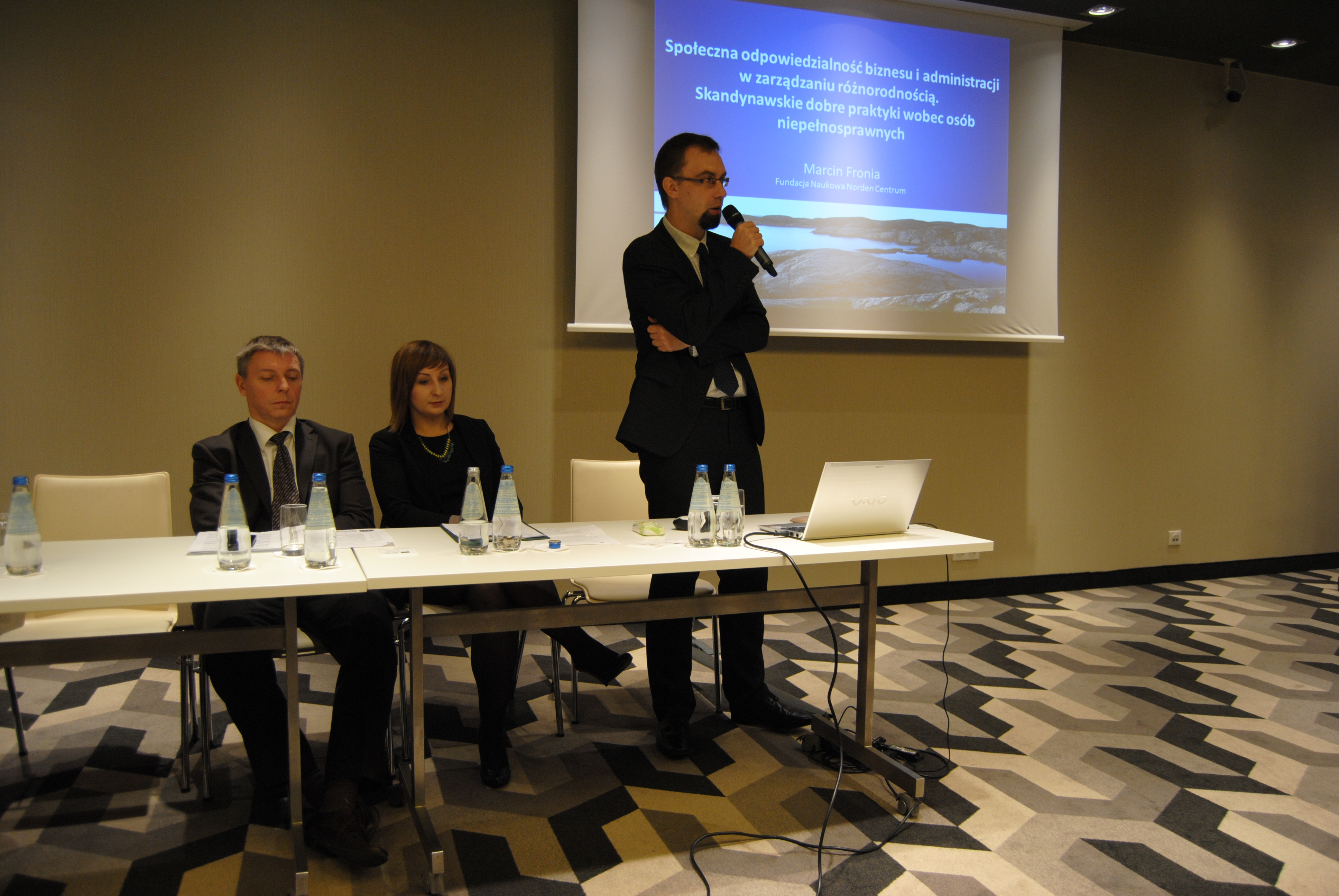 Pan Marcin Fronia – Dyrektor Wykonawczy Fundacji Norden Centrum zaprezentował temat: Społeczna odpowiedzialność biznesu i administracji w zarządzaniu różnorodnością. Skandynawskie dobre praktyki wobec niepełnosprawnych .