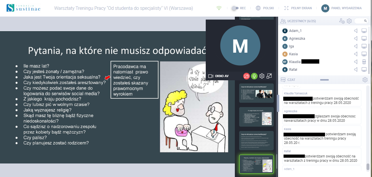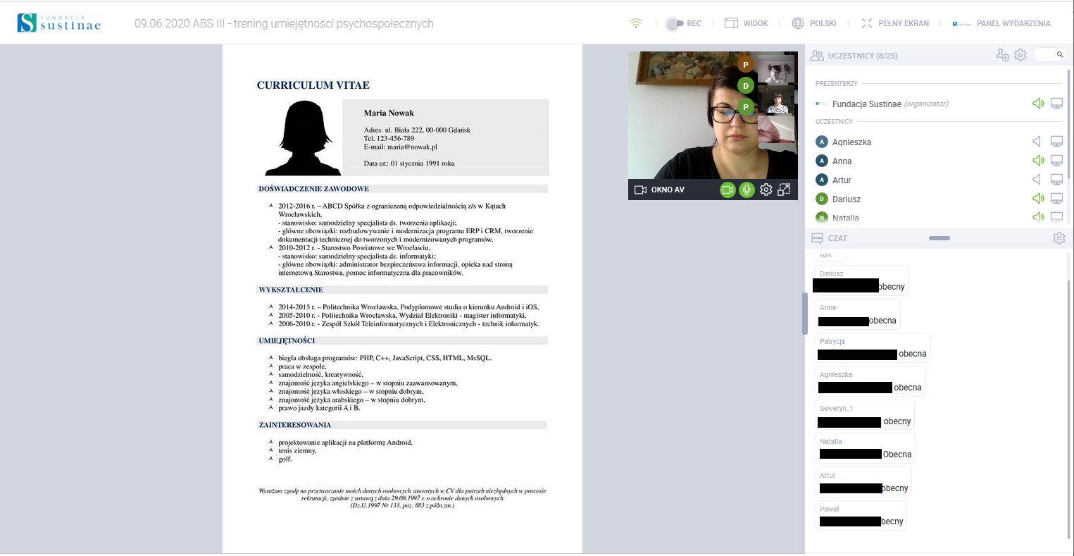 Przez niemal cały maj i czerwiec realizowano grupowe warsztaty treningu pracy dla Uczestników projektów z terenu Małopolski, Śląska, Mazowsza i Podkarpacia. Atrakcyjność i łatwość w dostępie warsztatów on-line została już wielokrotnie sprawdzona i potwierdzona przez Beneficjentów. W ramach spotkań odbyły się m.in. intensywne ćwiczenia rozmowy kwalifikacyjnej, dyskusje i omówienie zagadnień dotyczących m.in. metod poszukiwania pracy, technik relaksacji oraz praw osób z niepełnosprawnościami w miejscu pracy. Już niebawem, w okresie letnim planowane są kolejne warsztaty dla studentów i absolwentów w ramach projektów.