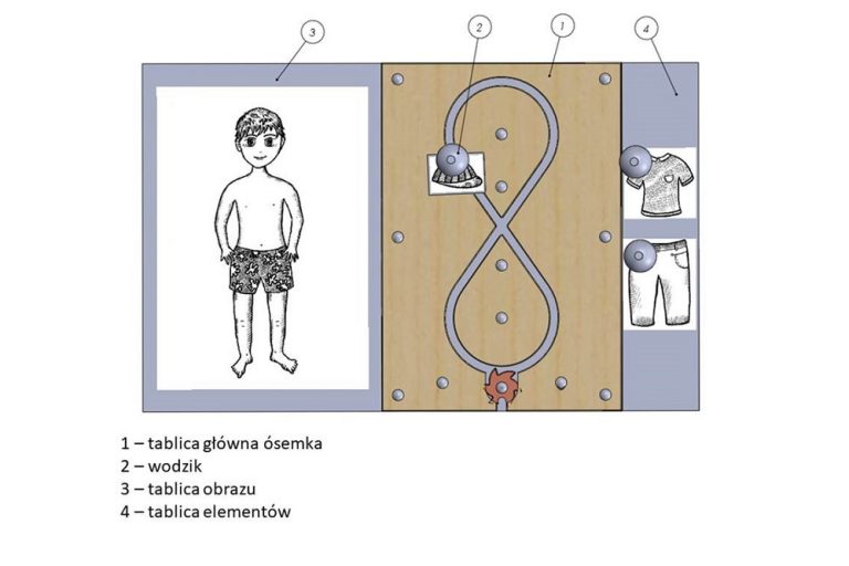 Zaprojektowana tablica ma kilka modułów - główny zawiera „ósemkę” oraz wodzik, to także tablica obrazu oraz tablica elementów. Wodzik ma stopkę oraz część chwytną, a w części górnej umiejscowiono lampkę LED. Dziecko przesuwa wodzik wraz z elementem obrazkowym po tablicy głównej, wzdłuż mechanizmu zębatkowego.