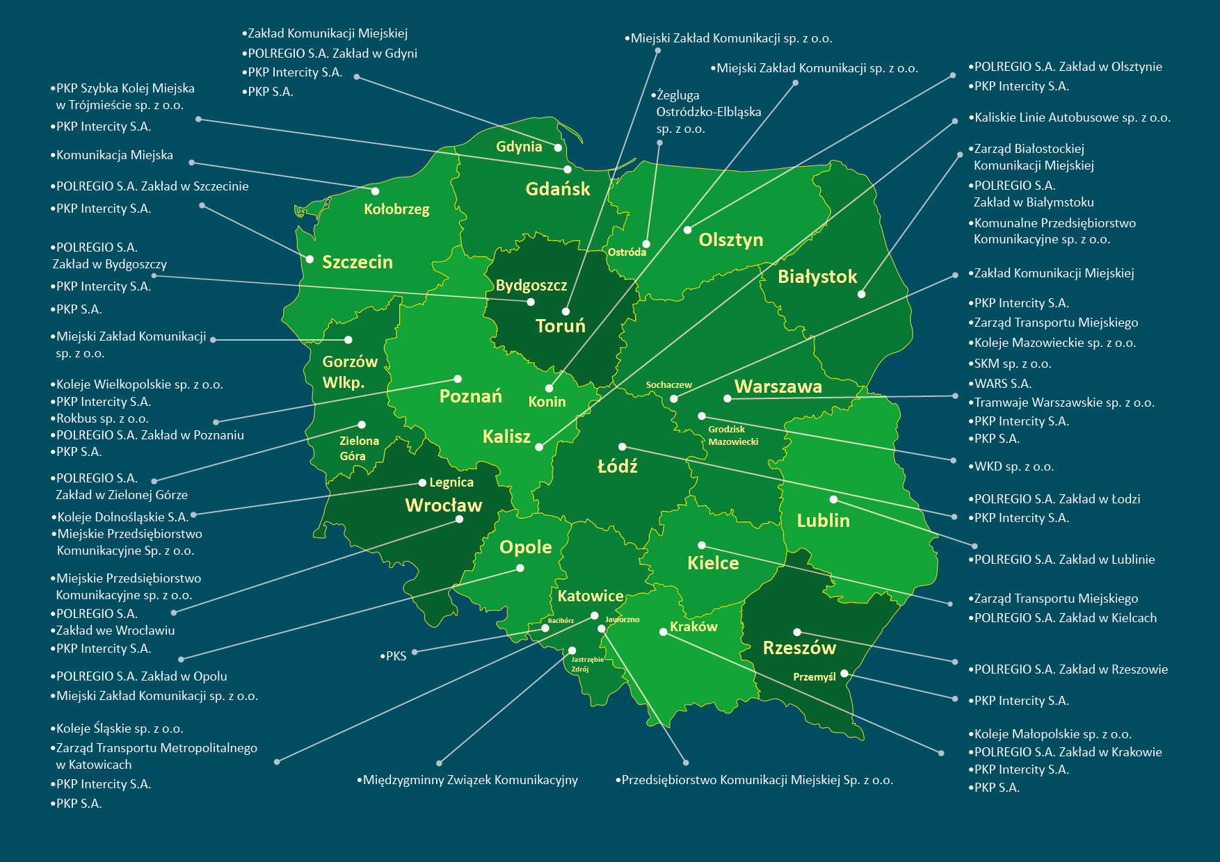 Mapa pokazuje miasta, w których wymienieni przewoźnicy i organizatorzy transportu zbiorowego przeszkolili swoich pracowników z obsługi „różnych podróżnych”, czyli osób ze szczególnymi potrzebami. Spośród nich, 13 podpisało deklarację Partnerstwa na rzecz dostępnej obsługi różnych podróżnych.