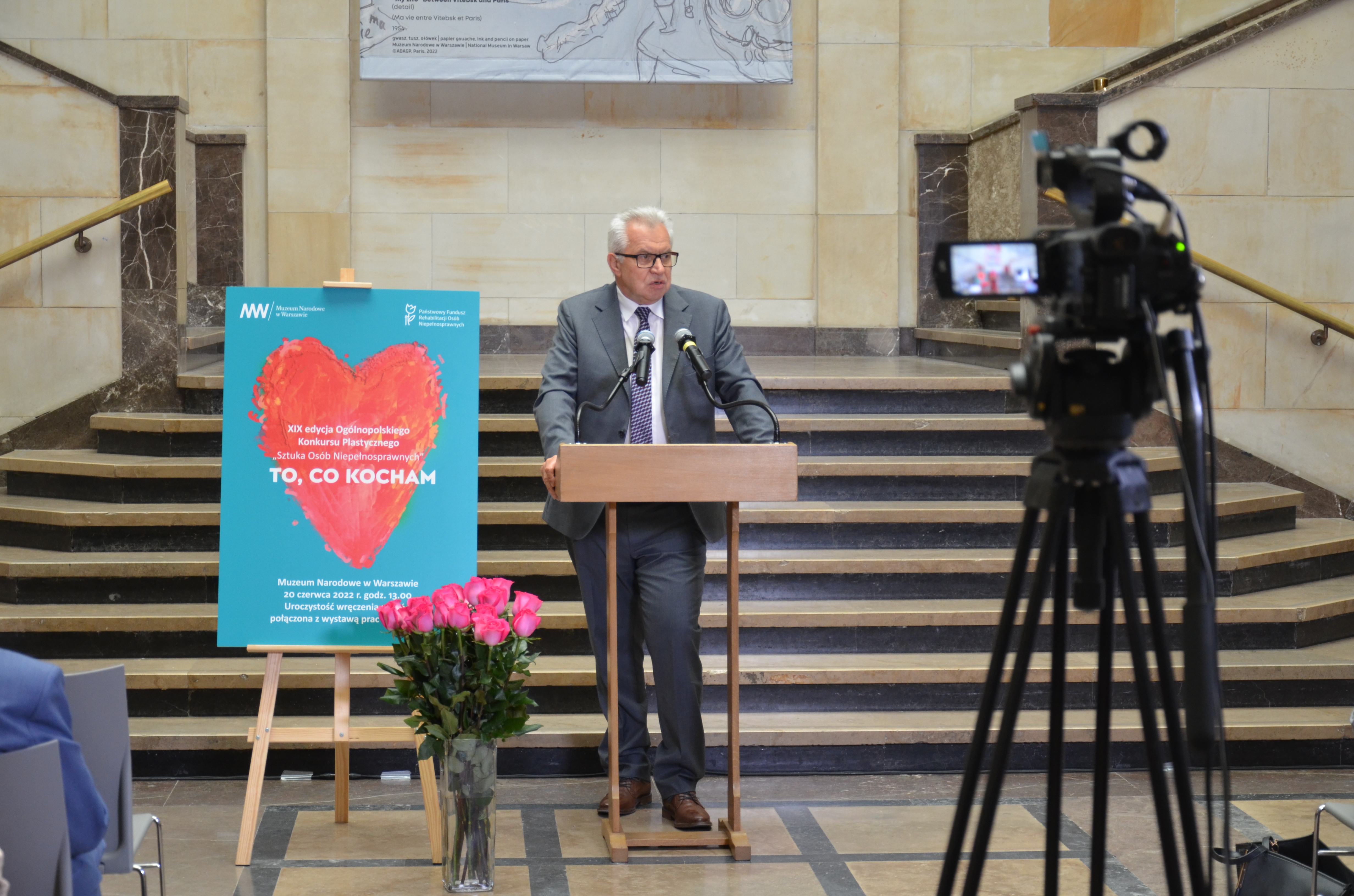 „Aktywność artystyczna jest dla osób z niepełnosprawnościami formą komunikowania się z otoczeniem. Sztuka tworzona przez niepełnosprawnych twórców pozwala nam zajrzeć w ich świat, dostrzec to, co chcą przekazać poprzez swoje dzieła. Serdecznie gratuluję wszystkim osobom nagrodzonym i wyróżnionym, a szczególne podziękowania kieruję do terapeutów, którzy przyczynili się do tego, że dziś możemy świętować sukcesy ich podopiecznych” – powiedział prezes zarządu PFRON Krzysztof Michałkiewicz.