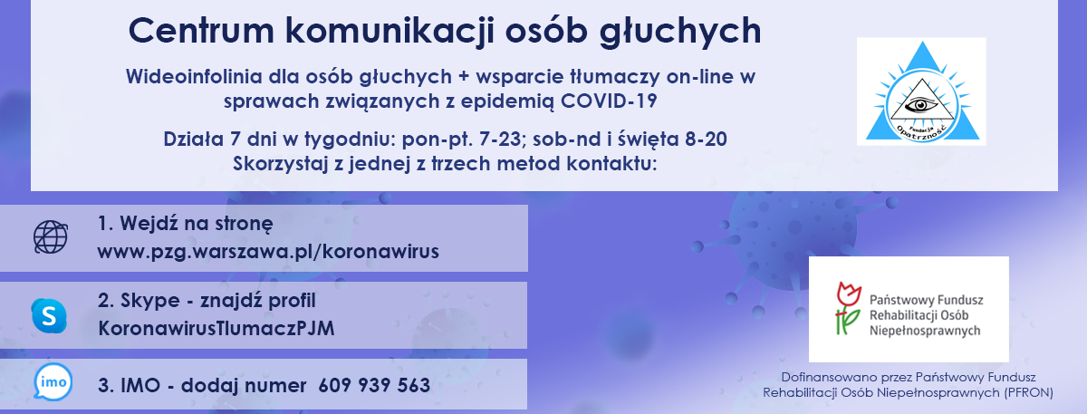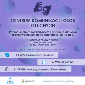 Dzięki wsparciu Państwowego Funduszu Rehabilitacji Osób Niepełnosprawnych (PFRON), Fundacja Opatrzność działającą przy Polskim Związku Głuchych w Warszawie uruchomiła „Centrum komunikacji dla osób głuchych”. Zadanie realizowane jest w okresie od 15.12.2020 r. do 30.06.2021 r.