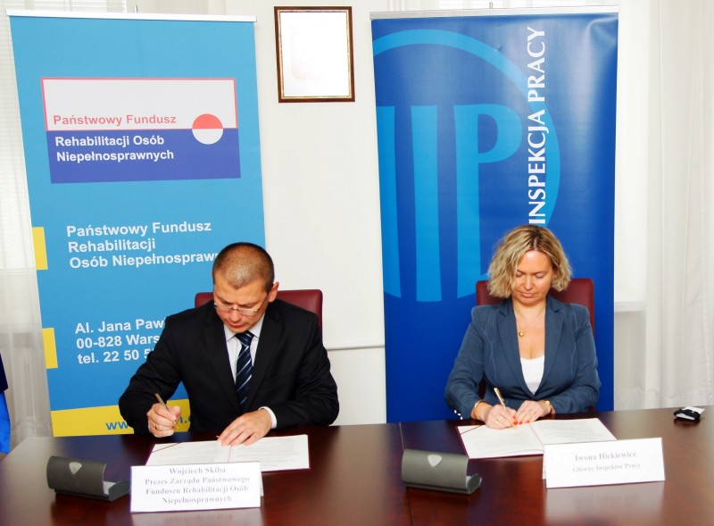7 maja 2013 r. Prezes PFRON Wojciech Skiba i Główny Inspektor Pracy Iwona Hickiewicz podpisali deklarację w zakresie współpracy i wzajemnej wymiany informacji. Jej celem jest podniesienie efektywności i skuteczności prowadzonych działań kontrolno-nadzorczych