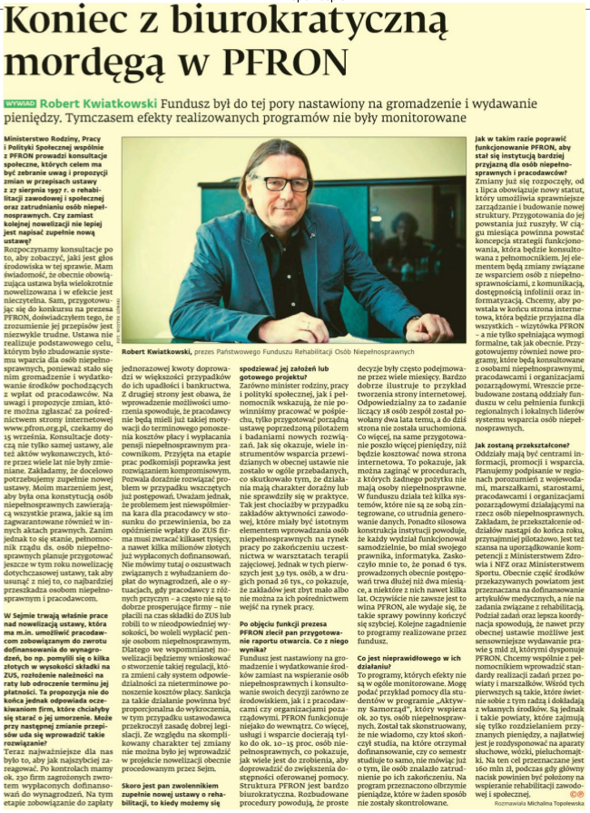 14 lipca ukazał się w Dzienniku Gazecie Prawnej wywiad Prezesa Zarządu PFRON Roberta Kwiatkowskiego. Rozmowę przeprowadziła red. Michalina Topolewska.