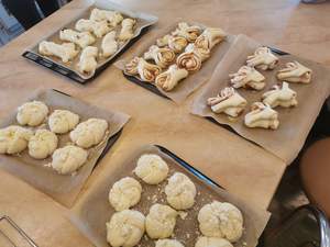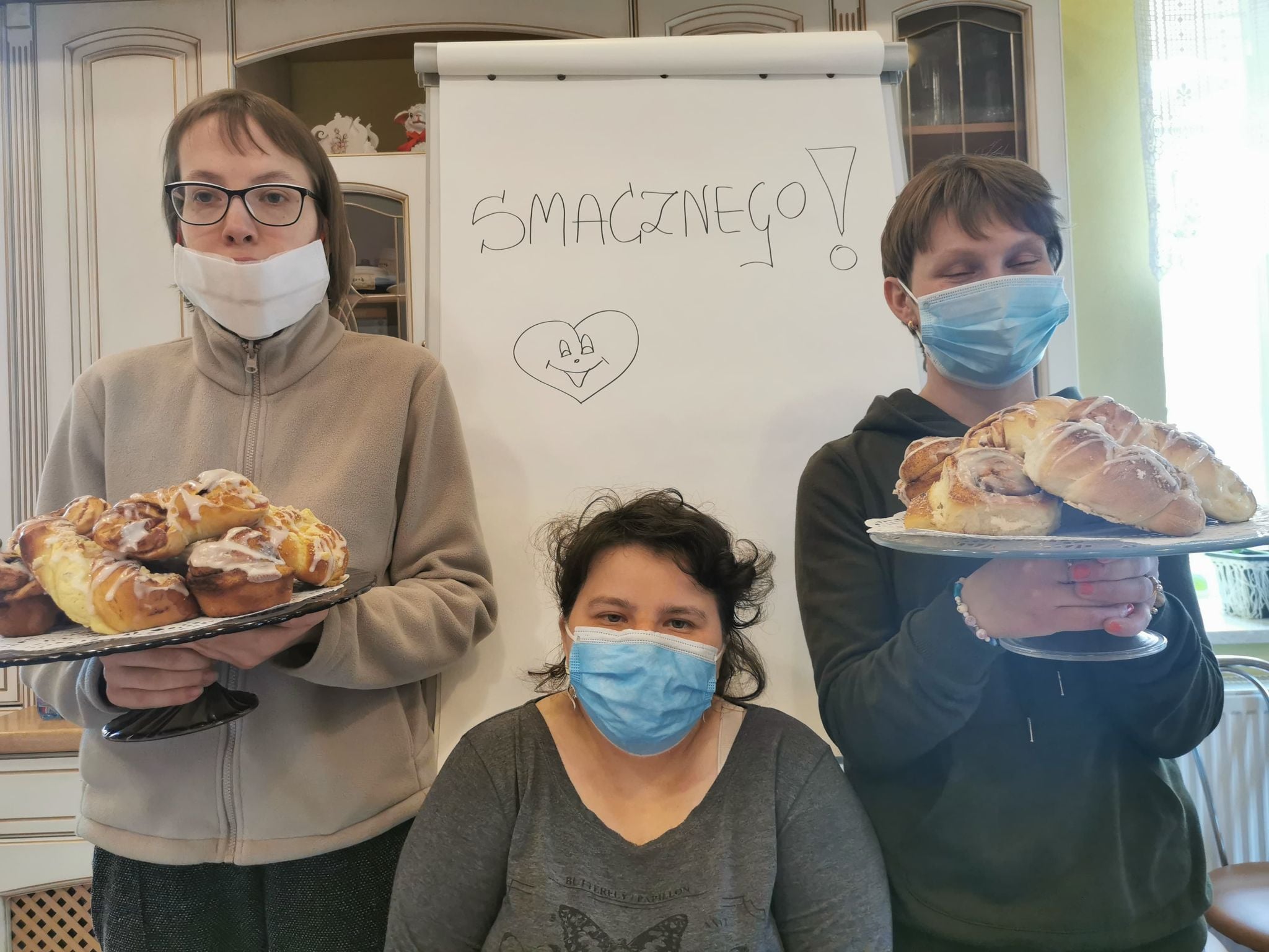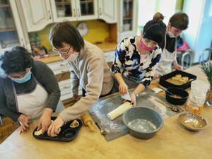 Po wprowadzeniu do tematu, uczestniczki zgromadzone w Pracowni Gospodarstwa Domowego pod okiem instruktora zawodu zabrały się do wypiekania drożdżówek. Sposobów składania ciasta drożdżowego i rodzajów nadzienia było kilka. Nauka formowania bułeczek w kształt serca czy motylka sprawiła podopiecznym najwięcej radości. Uczestniczki dumne z efektów końcowych swojej pracy mogły obdarować bułeczkami kolegów i koleżanki z innych Pracowni.