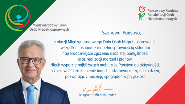 Z okazji tego święta prezes Państwowego Funduszu Rehabilitacji Osób Niepełnosprawnych Krzysztof Michałkiewicz życzył wszystkim osobom niepełnosprawnym "osobistej pomyślności oraz zrealizowania marzeń i planów". "Niech wsparcie najbliższych mobilizuje do aktywności, a życzliwość i zrozumienie innych ludzi towarzyszą na co dzień, pozwalając z nadzieją spoglądać w przyszłość" - powiedział.