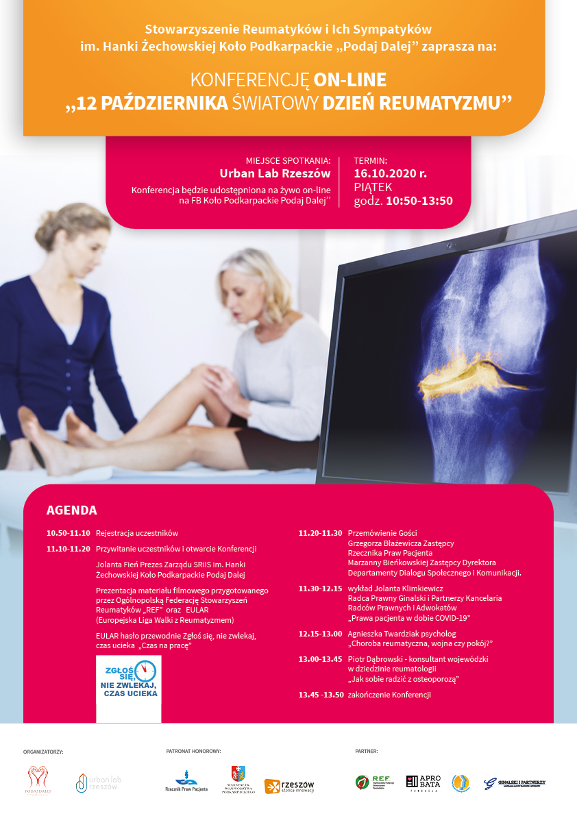 Stowarzyszenie Reumatyków i Ich Sympatyków im. Hanki Żechowskiej Koło Podkarpackie,, Podaj Dalej’’ zaprasza na Konferencję on-line ,,12 Października Światowy Dzień Reumatyzmu’’.