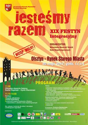 Warmińsko-Mazurski Sejmik Osób Niepełnosprawnych i Warmińsko-Mazurski Oddział PFRON w Olsztynie serdecznie zapraszają na XIX Festyn Integracyjny „Jesteśmy razem”, który odbędzie się 20 maja 2017 roku (sobota) na Rynku Starego Miasta w Olsztynie w godzinach 11-14.