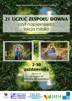 Zapraszamy na wyjątkową wystawę Stowarzyszenia Rodzin i Przyjaciół Osób z Zespołem Downa "SZANSA" w Filii Miejskiej Biblioteki Publicznej w Katowicach. Wystawę pt. „21 uczuć zespołu Downa, czyli najpiękniejsza lekcja miłości" będzie można oglądać do 30 października br.