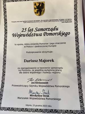 Wśród wyróżnionych znalazł się również Dyrektor Oddziału Pomorskiego PFRON Dariusz Majorek, który otrzymał nagrodę: „Za zaangażowanie w tworzenie samorządu na pomorzu, za wspólną wytężoną pracę dla dobra wspólnego i rozwoju regionu”.