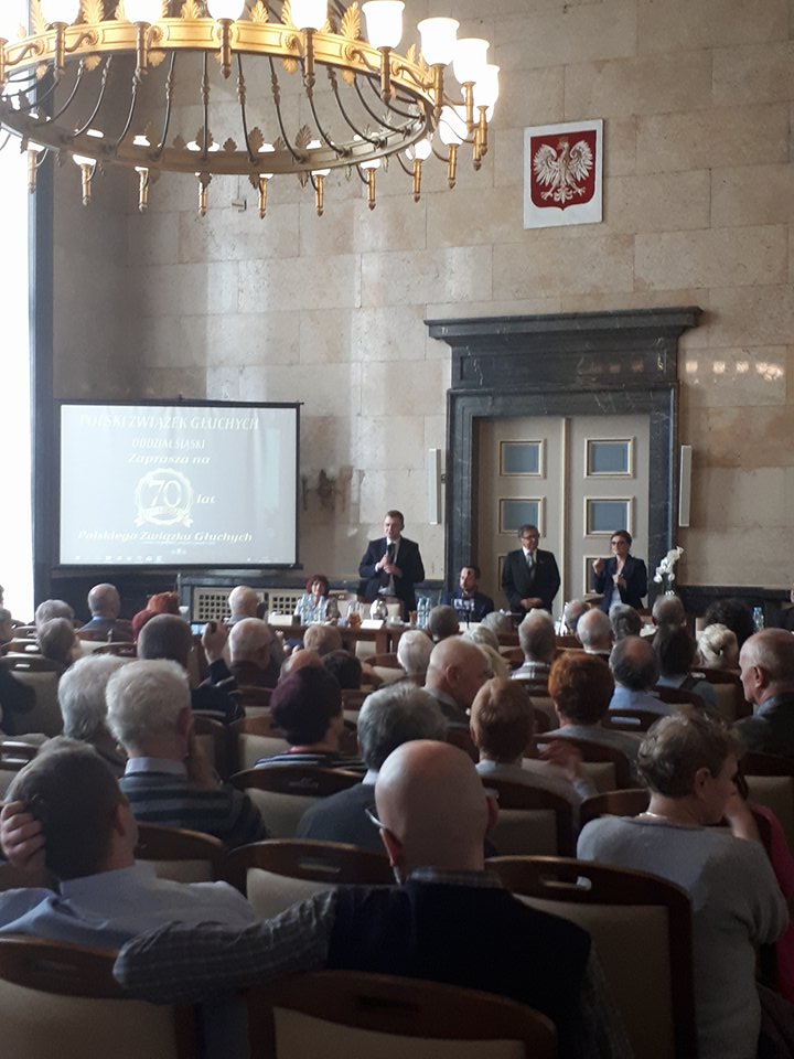 Stowarzyszenie PZG Oddział Śląski w tym roku obchodzi 70-tą rocznicę działalności. Z tej okazji 4 października odbyła się oficjalna Gala, nad którą patronat objął Marszałek Województwa Śląskiego. Uroczystość miała miejsce w Sali Marmurowej Gmachu Sejmu Śląskiego. W Gali wzięło udział 99 członków zrzeszonych w stowarzyszeniu oraz zaproszeni goście. Wśród obecnych gości znaleźli się Dyrektor Oddziału Śląskiego PFRON Jan Wroński, Prezes Zarządu Głównego Polskiego Związku Głuchych w Warszawie Krzysztof Kotyniewicz, Dyrektor Ośrodka Szkolno-Wychowawczego dla Niesłyszących i Słabo Słyszących w Raciborzu Agata Tańska, Dyrektor Zespołu Szkolno-Przedszkolnego dla Dzieci Niesłyszących i Słabo Słyszących w Katowicach Aleksandra Doktorowicz.
