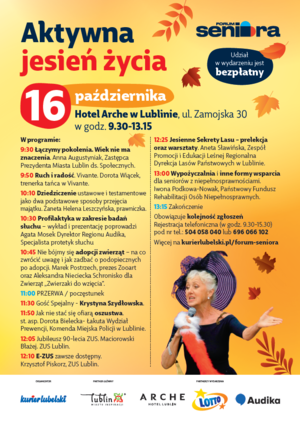 Podczas wydarzenia uczestnicy będą mogli wziąć udział w interesujących wykładach i warsztatach, które dotyczyć będą zdrowia, prawnych aspektów dziedziczenia, bezpieczeństwa oraz wsparcia dostępnego dla seniorów. Wykład pt. "Wypożyczalnia i inne formy wsparcia dla seniorów z niepełnosprawnościami" wygłosi Iwona Podkowa-Nowak, Specjalista ds. CIDON Oddziału Lubelskiego PFRON.