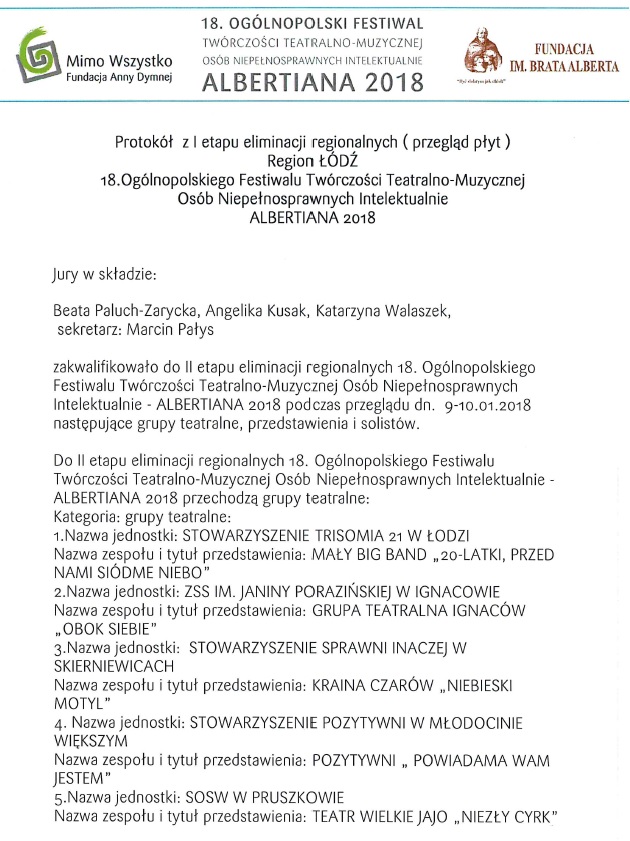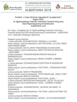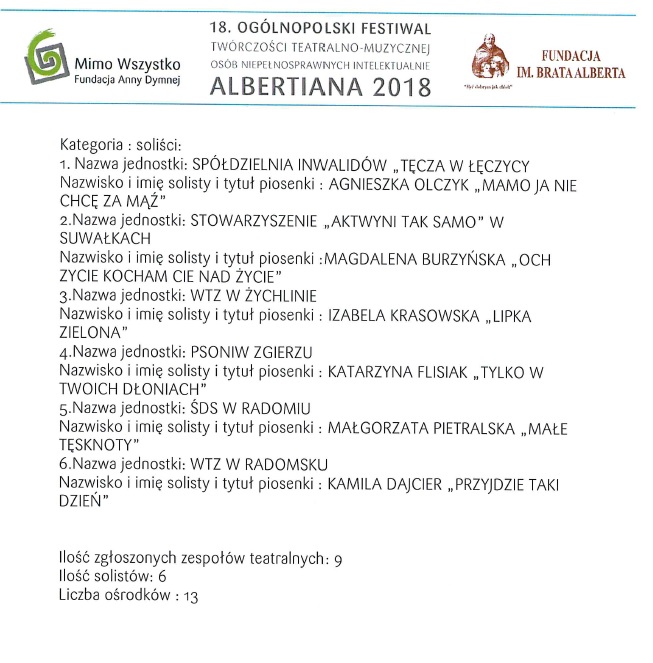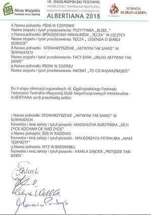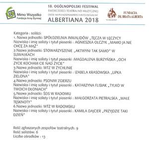 W środę w Szkole Podstawowej nr 8 w Zgierzu odbyły się Regionalne Eliminacje do XVIII Ogólnopolskiego Festiwalu Twórczości Teatralno-Muzycznej Osób Niepełnosprawnych Intelektualnie ALBERTIANA 2018, w których wystąpiło 9 zespołów teatralnych i 6 solistów z 13 ośrodków regionalnych z województwa łódzkiego, mazowieckiego i podlaskiego.