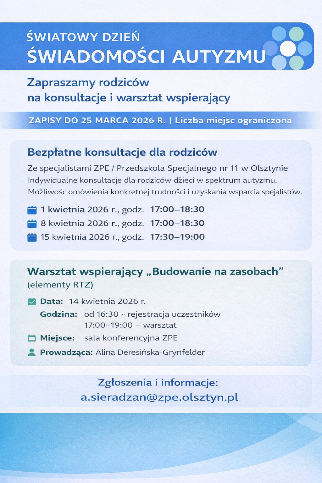 Ponadto 14 kwietnia 2026 r. odbędzie się warsztat wspierający dla rodziców pn. „Budowanie na zasobach” (elementy RTZ). Rejestracja uczestników rozpocznie się o godz. 16:30, a warsztat potrwa od 17:00 do 19:00. Zajęcia poprowadzi Alina Deresińska-Grynfelder. Miejscem wydarzenia jest sala konferencyjna Zespołu Placówek Edukacyjnych w Olsztynie.