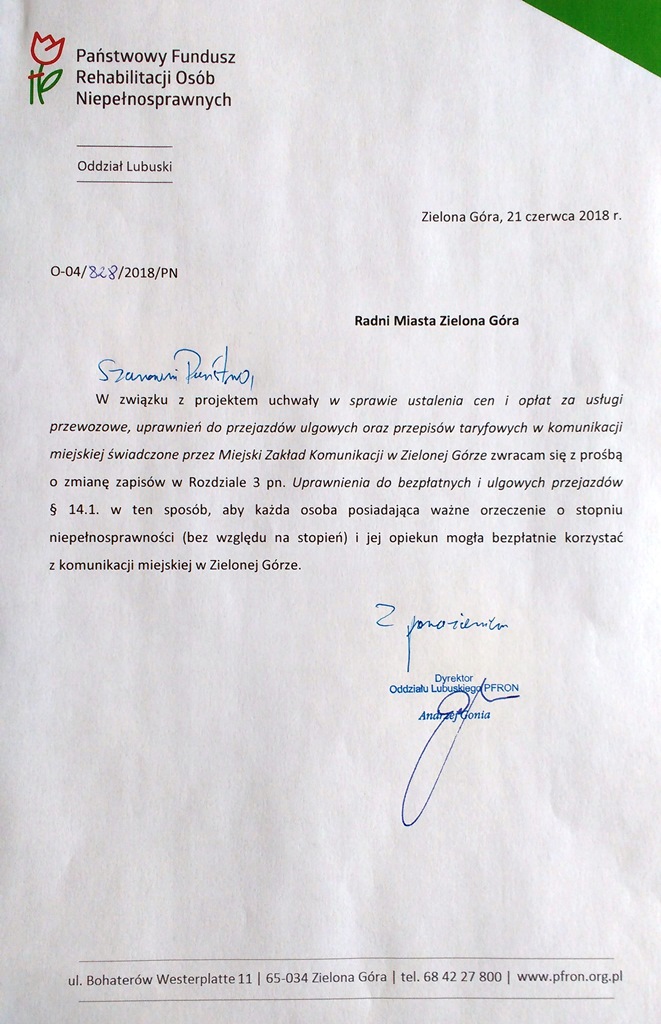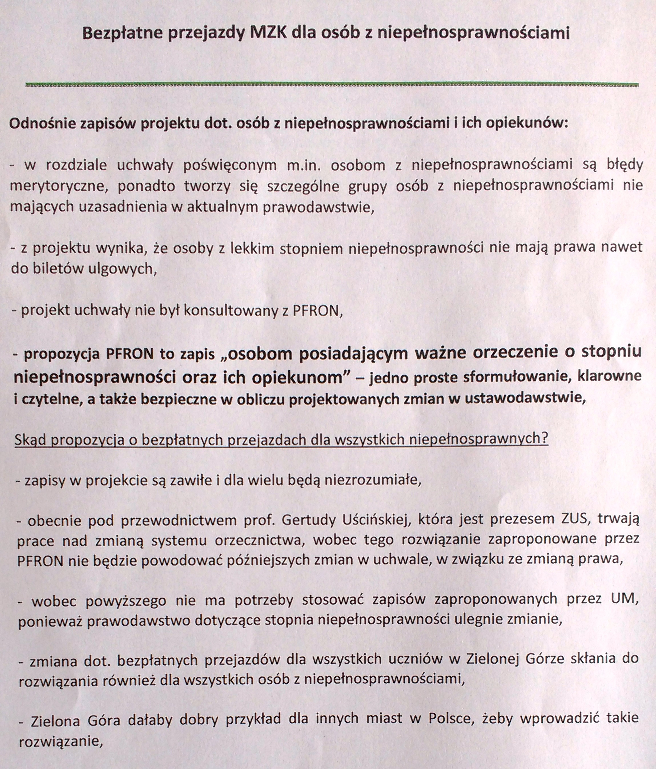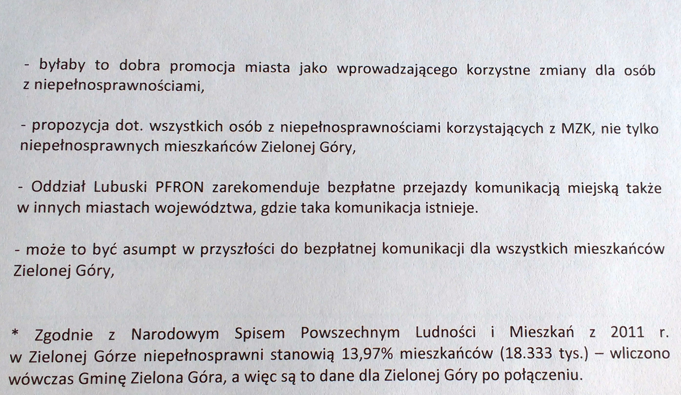 W związku z uchwałą wprowadzającą w Zielonej Górze bezpłatne przejazdy MZK dla uczniów, Oddział Lubuski zaproponował zmianę w uchwale, która pozwoliłaby na wprowadzenie bezpłatnych przejazdów również dla wszystkich osób z niepełnosprawnościami (bez względu na stopień niepełnosprawności) oraz ich opiekunów.
