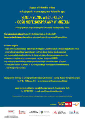Projekt „Sensoryczna Wieś Opolska - gość niepełnosprawny w muzeum” jest odpowiedzią na ograniczenia w dostępie do kultury dla osób z niepełnosprawnością wzroku. We współpracy z Fundacją Szansa dla Niewidomych Muzeum Wsi Opolskiej organizuje bezpłatne zajęcia edukacyjne w miesiącach wrzesień-październik br. W ramach 4-godzinnego spotkania uczestnicy zwiedzą ekspozycję muzealną oraz wezmą udział w warsztatach kowalstwa. Zajęcia kierowane są do 10-osobowych grup zwiedzających z dysfunkcją wzroku.