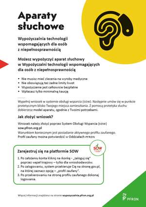 Wniosek należy złożyć poprzez System Obsługi Wsparcia (SOW). Warunkiem koniecznym jest posiadanie aktywnego profilu zaufanego. Profil zaufany można potwierdzić w Oddziałach PFRON. Wypełnij wniosek, a następnie umów się w punkcie protetycznym blisko Twojego miejsca zamieszkania. Z pomocą protetyka słuchu dobierzesz model aparatu, zgodnie z twoimi potrzebami.