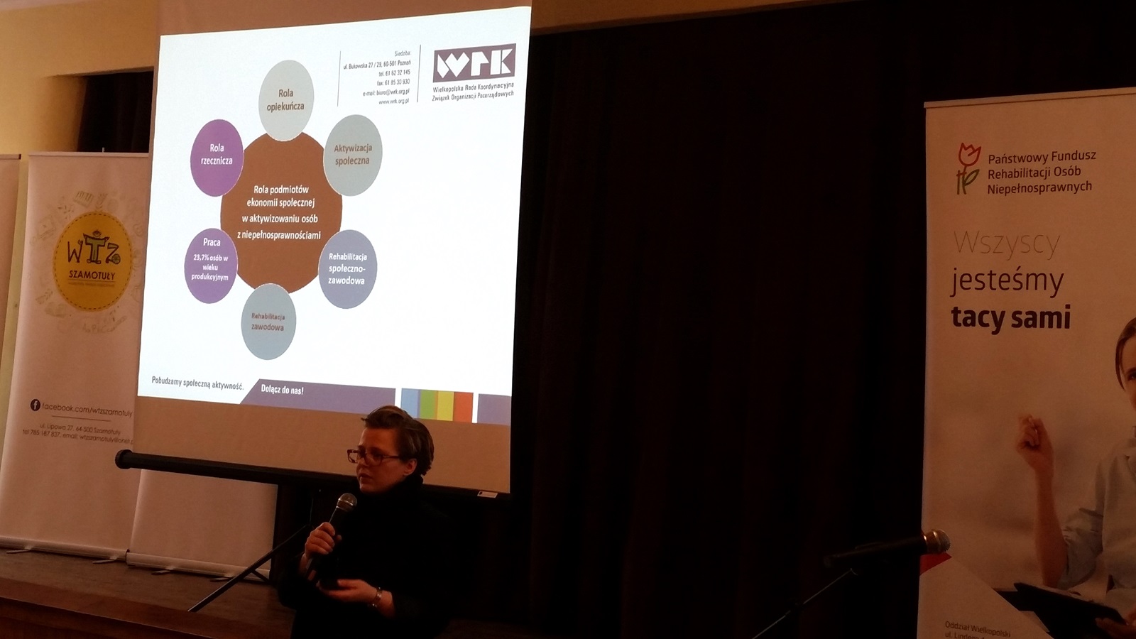 Wśród prelegentów byli specjaliści z wielkopolskich ośrodków ekonomii społecznej. Jarosław Wypyszyński przedstawił zalety zamówień społecznie odpowiedzialnych, które mogą być elementem spójnego systemu aktywizacji zawodowej osób z niepełnosprawnościami. Prezes Wielkopolskiej Rady Koordynacyjnej Związku Organizacji Pozarządowych Justyna Ochędzan zwróciła uwagę na kluczową zasadę ekonomii społecznej: nie maksymalizacji zysku, a głównie działań ukierunkowanych na rzecz konkretnych osób i społeczeństw lokalnych.
