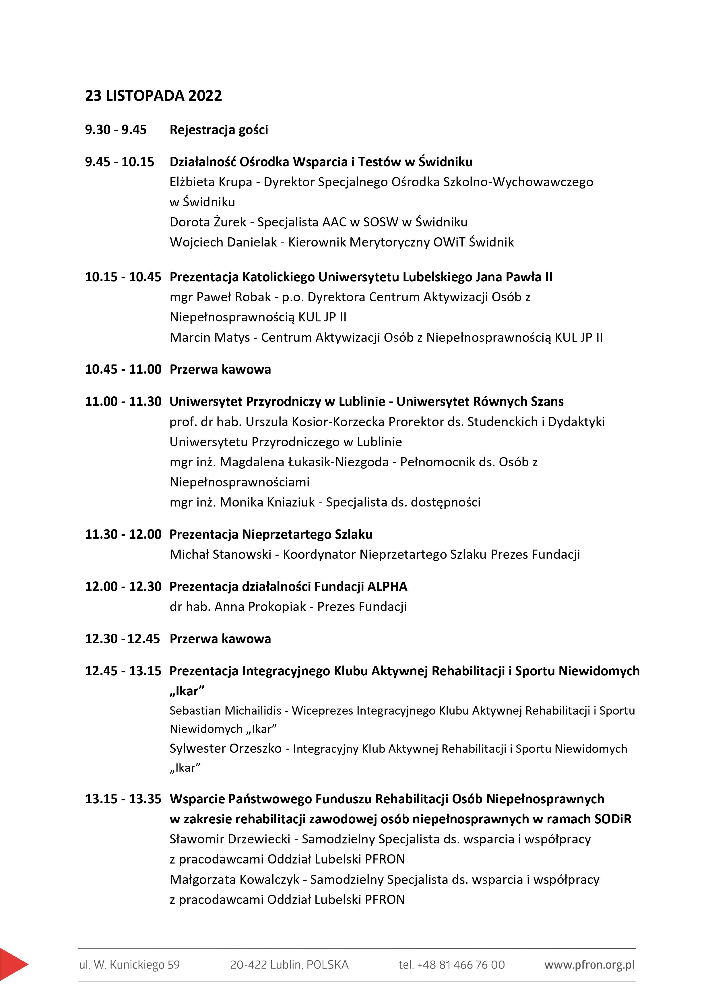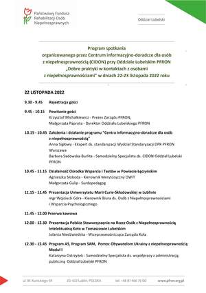 W trakcie konferencji przedstawione zostaną programy realizowane przez PFRON, w tym program CIDON mający na celu zapewnienie indywidualnego wsparcia dla osób z niepełnosprawnościami. Spotkanie będzie okazją do prezentacji dobrych praktyk w kontaktach z osobami z niepełnosprawnościami ze strony wybranych lubelskich uczelni i organizacji pozarządowych. Swoją działalność zaprezentują Ośrodki Wsparcia i Testów w Świdniku i w Łęcznej.