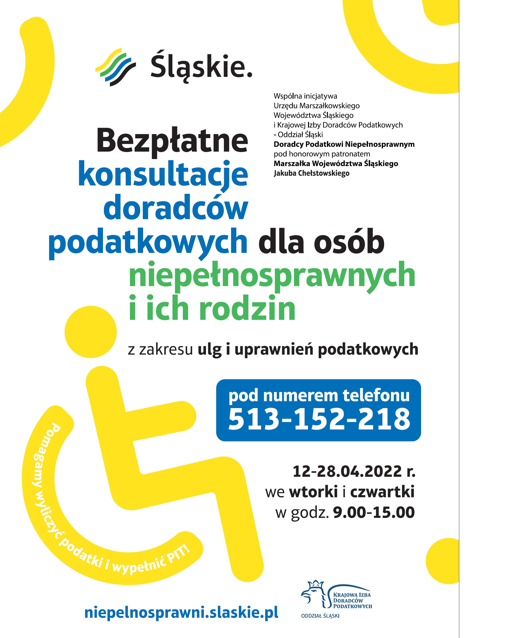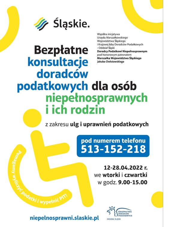 Bezpłatne konsultacje z zakresu ulg i uprawnień podatkowych prowadzone są we wtorki i czwartki w godzinach od 9.00 do 15.00 pod numerem telefonu 513 152 218. Na życzenie osób niepełnosprawnych doradca będzie oddzwaniał na własny koszt. Akcja potrwa do 28 kwietnia 2022 roku.