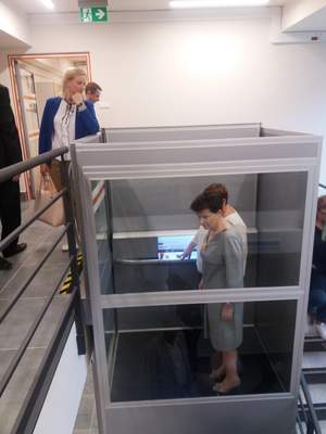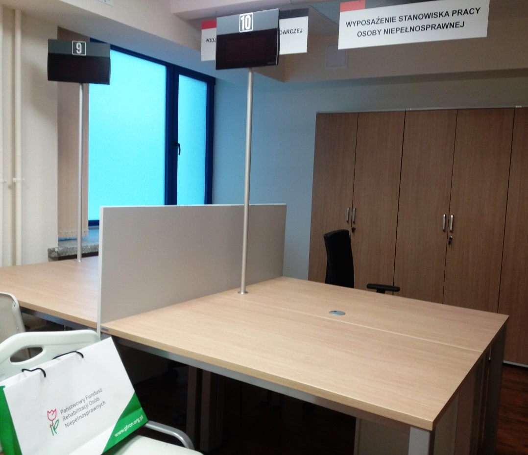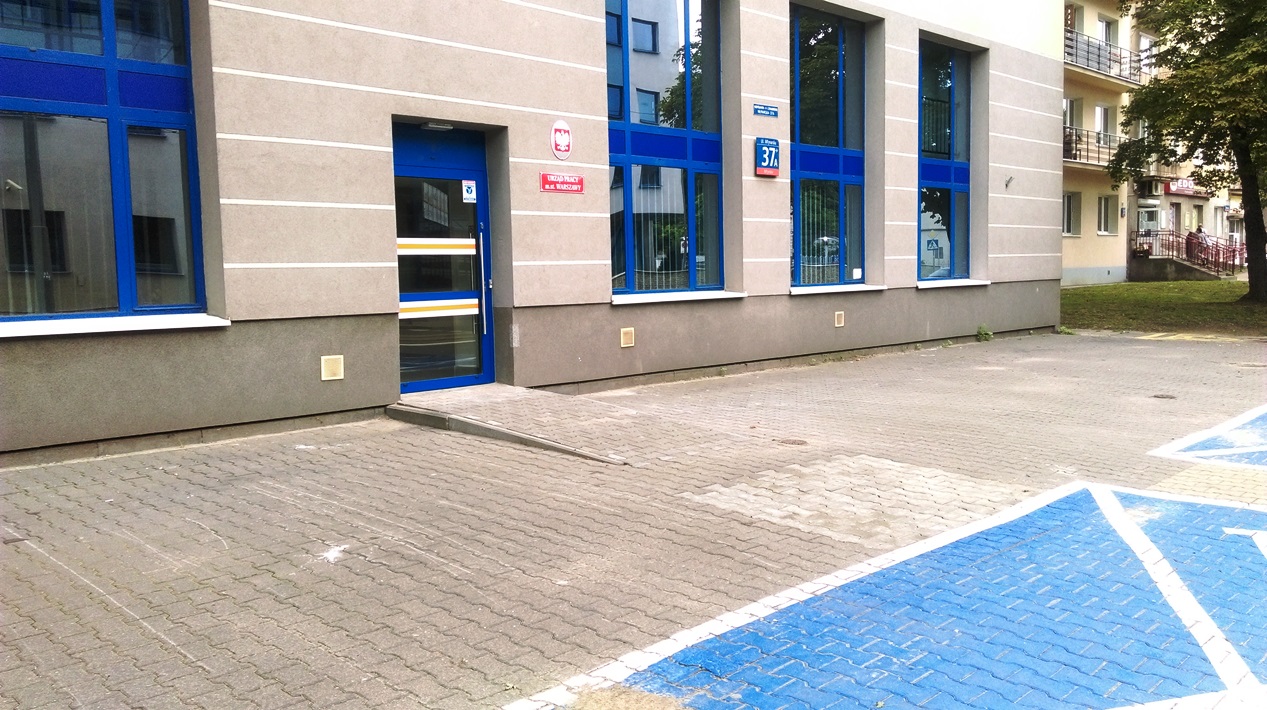 Nowy budynek Urzędu Pracy przy ul. Młynarskiej 37a w Warszawie jest dostosowany do potrzeb klientów z niepełnosprawnością a jego wnętrze jej zaaranżowane w przyjazny sposób (podnośnik, szerokie korytarze, pętle indukcyjne, kontrastowe oznakowania).
