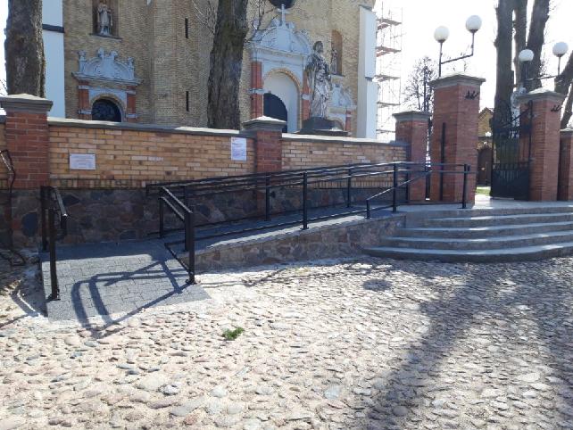 W ramach projektu wykonano pochylnię wydzieloną z części schodów stanowiącą połączenie istniejącego parkingu i wejścia na teren przykościelny. Pochylnia przylega bezpośrednio do istniejącego muru kamienno-klinkierowego. Zlikwidowano barierę architektoniczną, zapewniono wolną od barier poziomych i pionowych przestrzeń komunikacyjną na terenie przykościelnym zabytkowego kościoła parafialnego. Pochylnia dla osób z niepełnosprawnościami, umożliwia swobodne i bezpieczne przemieszczanie się z parkingu na teren przykościelny. Inwestycja została zrealizowana jednoetapowo na nieruchomości będącej własnością parafii.