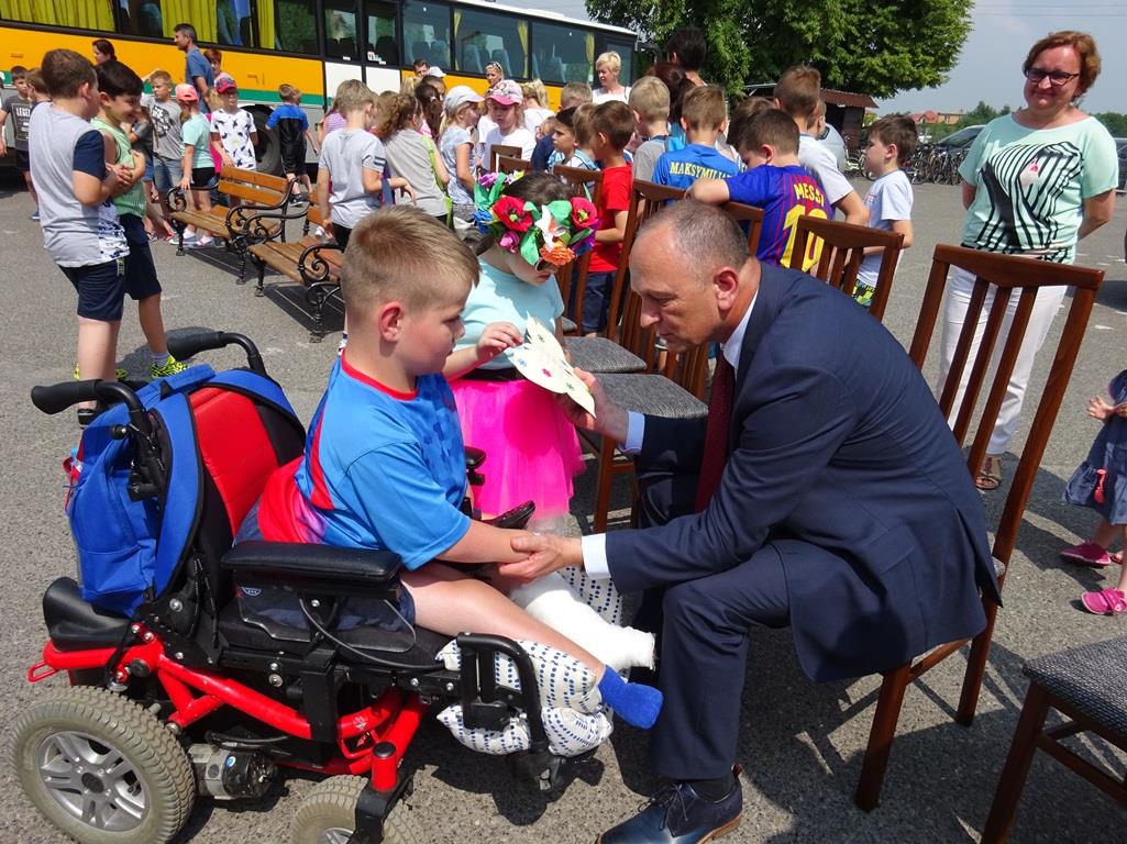 Dzisiaj Dyrektor Oddziału Podkarpackiego PFRON Maciej Szymański miał przyjemność wziąć udział w uroczystych obchodach Dnia Dziecka, które odbyły się w Zespole Szkolno-Przedszkolnym z Oddziałami Integracyjnymi w Orłach. Zaproszenie na to wydarzenie, kilka dni wcześniej, wręczyła mu osobiście jedenastoletnia Maja, która wraz ze starszym kolegą Marcelem, pod opieką Pani Dyrektor Renaty Iwanów przyjechała do naszego Oddziału.