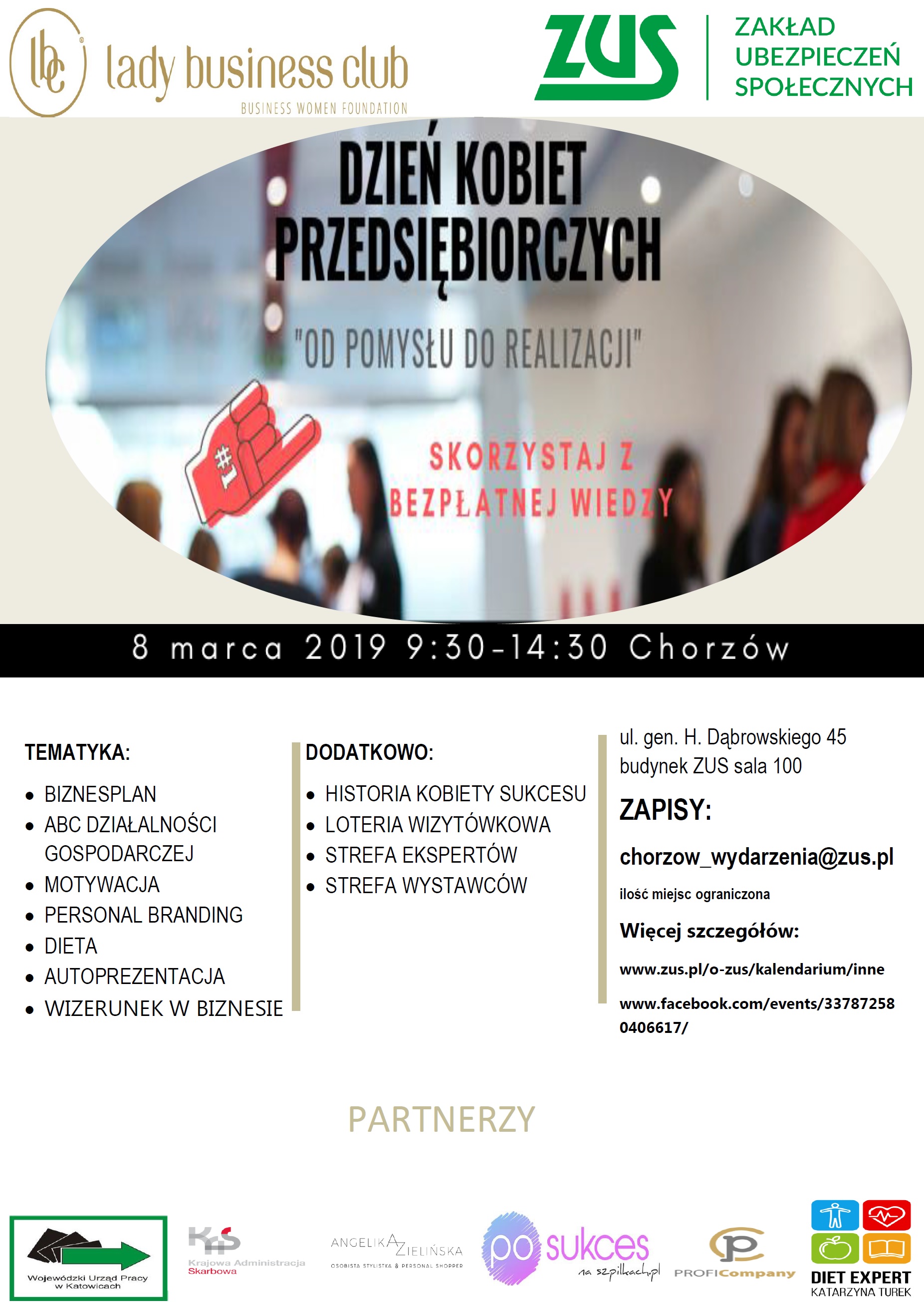 Dla wszystkich kobiet, które planują rozpocząć działalność gospodarczą, prowadzą już swój własny biznes lub są zainteresowane tematyką biznesu przygotowano ciekawą propozycję. 8 marca br. odbędzie się Dzień Kobiet Przedsiębiorczych pod hasłem „Od pomysłu do realizacji”. Organizatorami są: Oddział ZUS w Chorzowie i Lady Business Club Women Foundation z Warszawy.