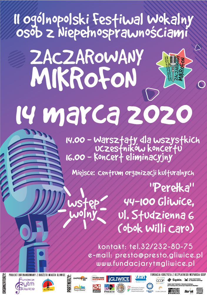 Przed nami II edycja Ogólnopolskiego Festiwalu Wokalnego Osób z Niepełnosprawnościami „Zaczarowany mikrofon” 2020. Trwają zapisy na koncerty eliminacyjne. Koncert finałowy z nagrodami pieniężnymi i rzeczowymi, zaplanowany jest na 24 października br.
