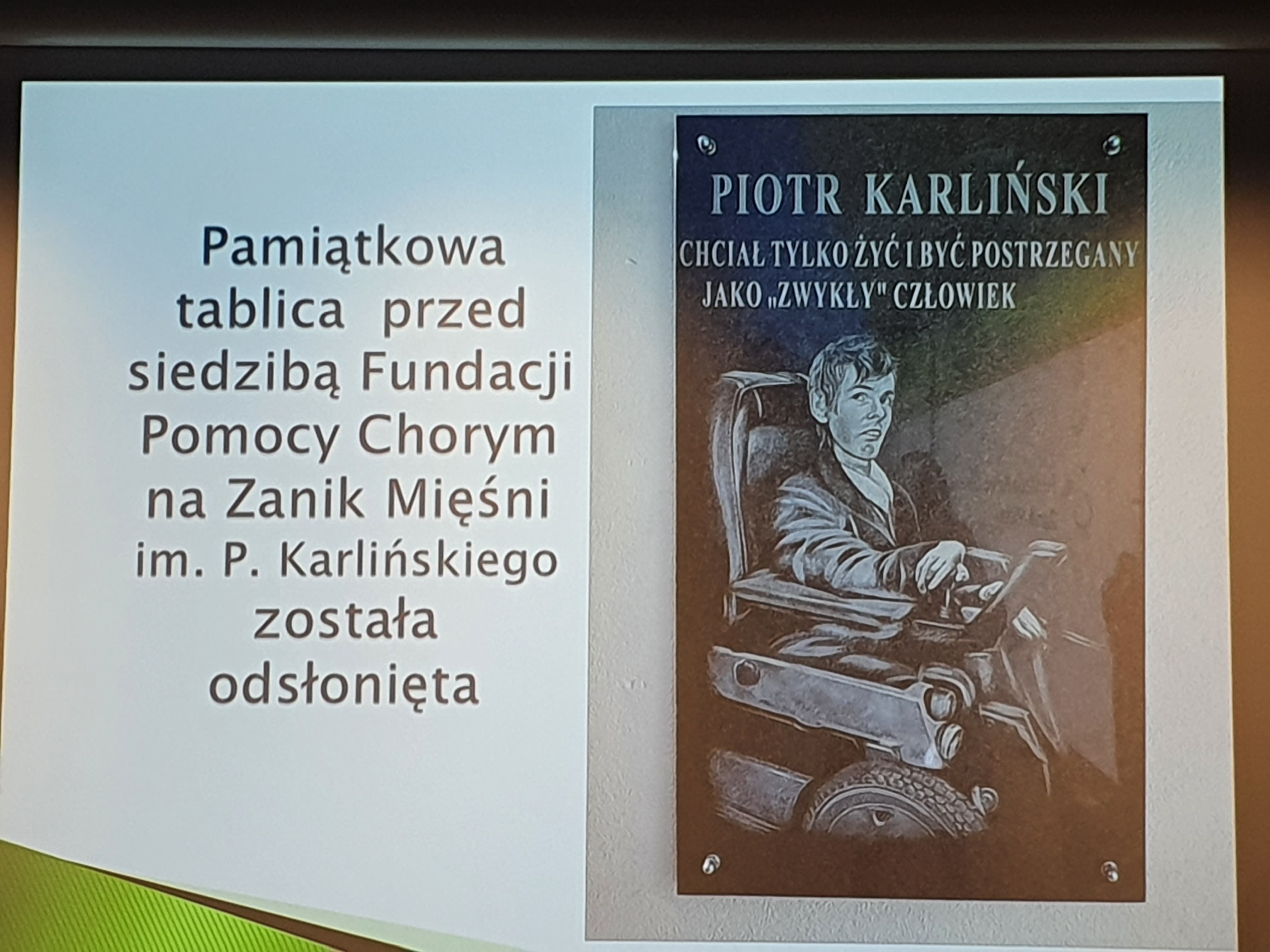 Tuż przed konferencją przy siedzibie Fundacji Pomocy Chorym na Zanik Mięśni im. Piotra Karlińskiego w Szczecinie odsłonięto tablicę pamiątkową ku pamięci jej patrona.