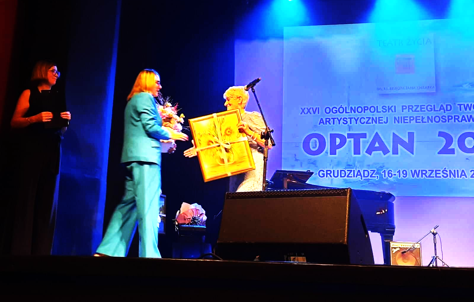 18 września w Centrum Kultury TEATR w Grudziądzu odbył się finał XXVI Ogólnopolskiego Przeglądu Twórczości Artystycznej Niepełnosprawnych OPTAN 2024. Organizatorem wydarzenia było Centrum Rehabilitacji im. ks. Bpa Jana Chrapka. Pracownicy naszego Oddziału – Pani Anna Wankiewicz-Lewandowska i Pan Łukasz Ambrożkiewicz - wzięli udział w uroczystej Gali. Od Dyrektor Oddziału Kujawsko-Pomorskiego – Aleksandry Gierej wręczyli Pani Halinie Kowalkowskiej - Prezes Centrum Rehabilitacji - list gratulacyjny oraz kwiaty.