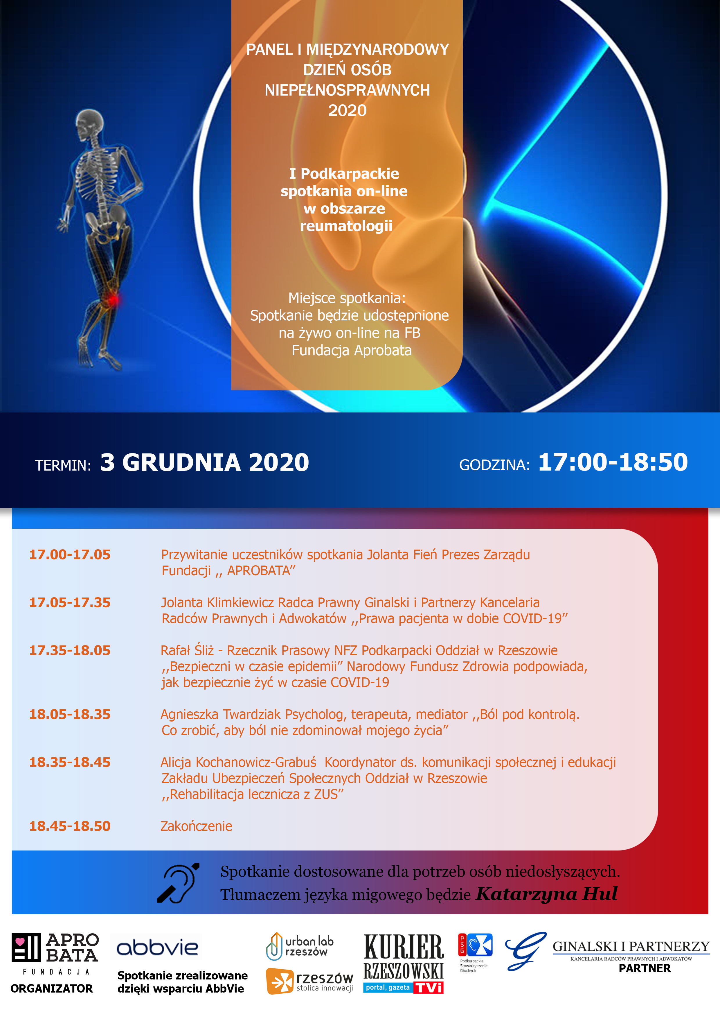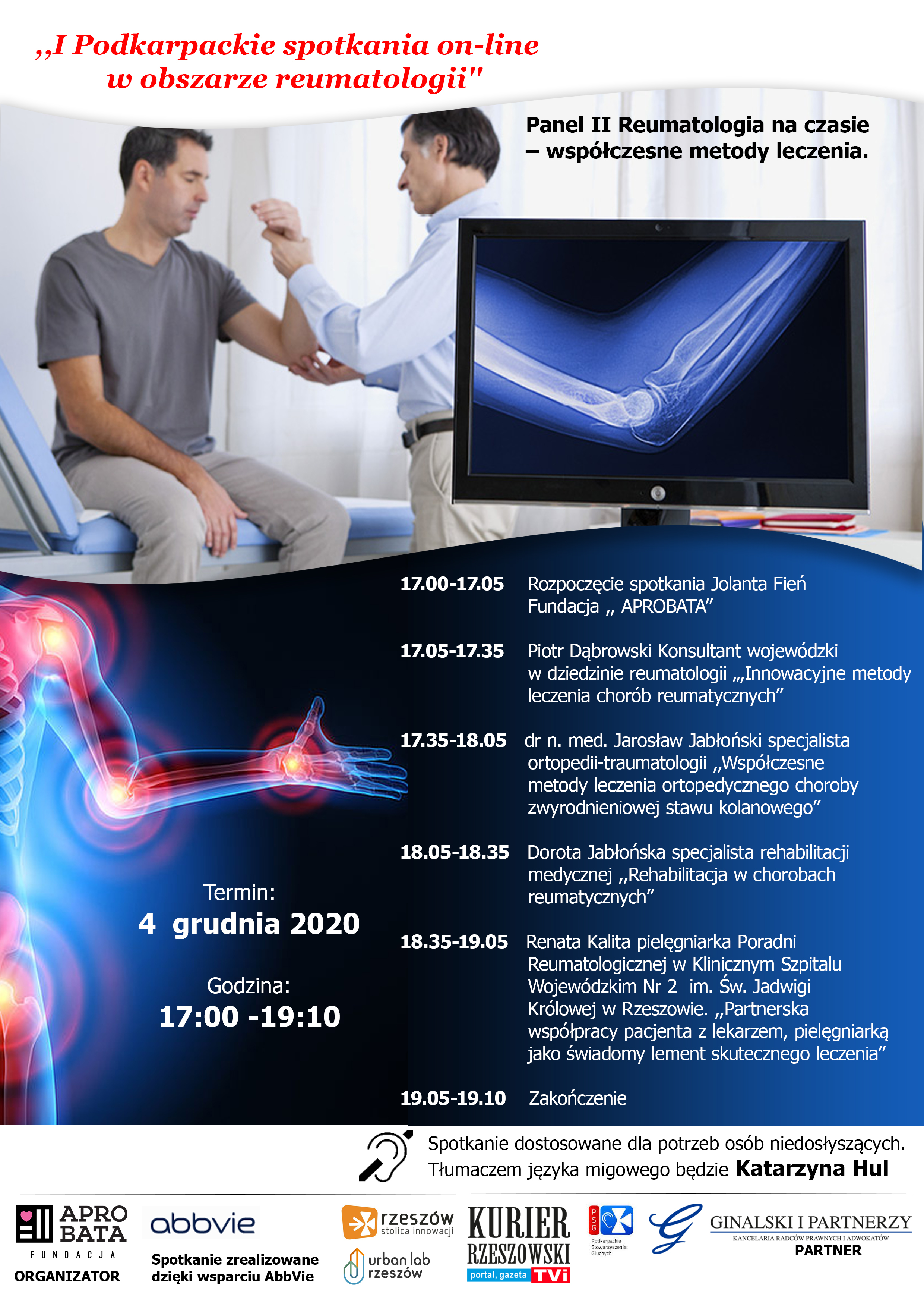 W imieniu organizatorów – Fundacji „Aprobata” z siedzibą w Rzeszowie - zapraszamy do udziału w wydarzeniu ,,I Podkarpackie spotkania on-line w obszarze reumatologii''