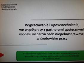 III spotkanie Partnerstwa międzypowiatowego na rzecz ożywienia społeczno-gospodarczego powiatów legionowskiego i nowodworskiego było wyśmienitą okazją do zaprezentowania wsparcia PFRON dla przedsiębiorców przy tworzeniu i utrzymaniu miejsc pracy dla osób z niepełnosprawnościami. Pracownicy Oddziału Mazowieckiego przedstawili między innymi założenia projektu unijnego „Wypracowanie i upowszechnianie, we współpracy z partnerami społecznymi, modelu wsparcia osób niepełnosprawnych w środowisku pracy” oraz programu „Stabilne zatrudnienie”.